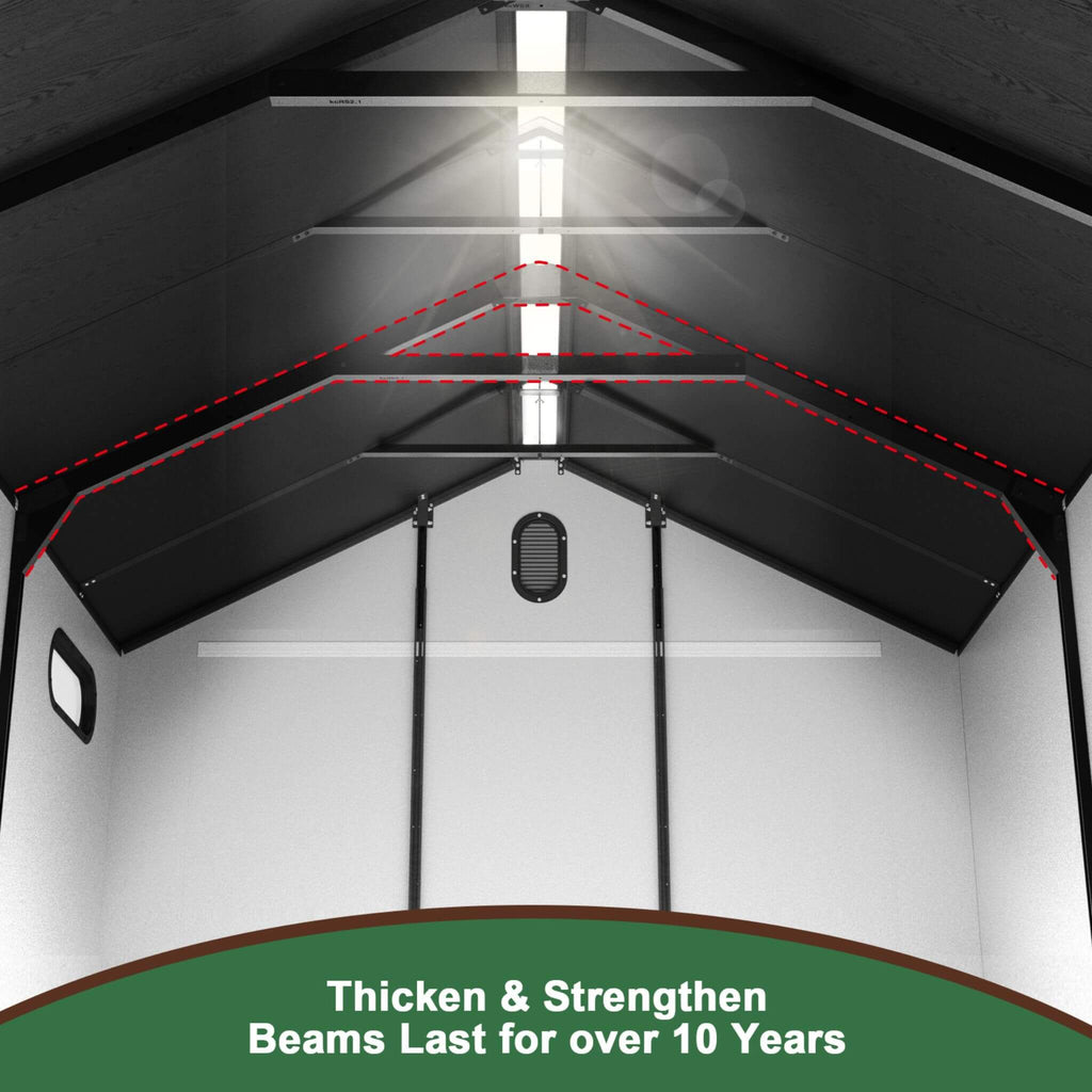 Enjoy unmatched versatility with a storage shed that stands up to the elements. Engineered to endure rain, snow, and UV exposure, the double-layer polypropylene and steel-reinforced structure offers superior strength and resilience. Natural skylights and windows bathe the interior in daylight, while built-in air vents improve ventilation by keeping moisture and mold at bay. Whether it’s lawnmowers, power tools, or seasonal décor, your items stay well-organized and securely protected.