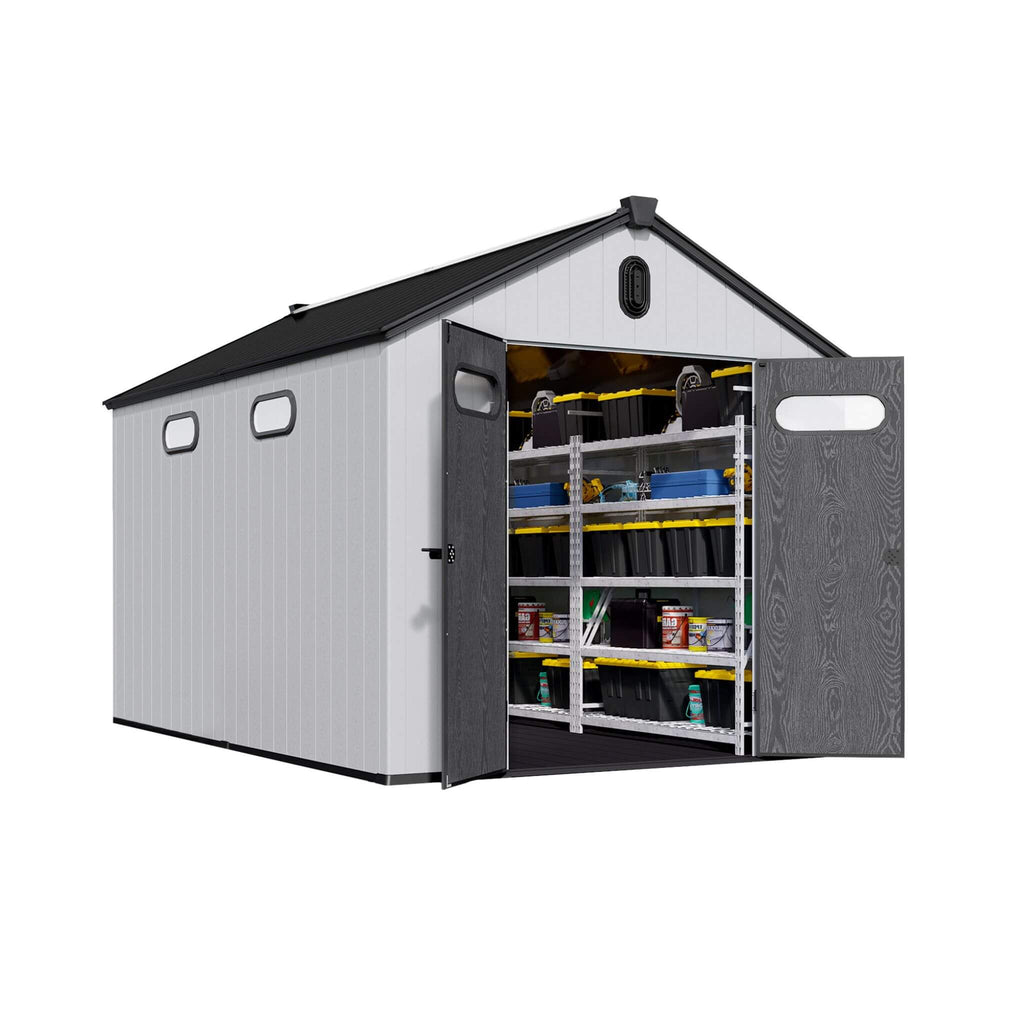 Bring durability and elegance to your outdoor storage with the [08X12FT] Large Polypropylene Storage Shed. Designed with a sleek black-and-gray finish that complements any backyard aesthetic, this shed combines style and practicality to give you a premium storage solution. With its spacious interior, reinforced features, and lockable swing doors, it’s your reliable partner for safely housing everything from garden essentials to heavy-duty equipment.