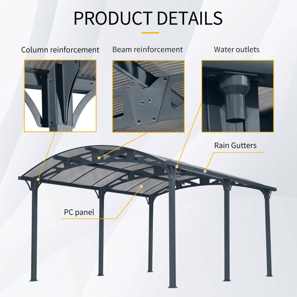 - Designed with an innovative arch and integrated gutters, the carport channels rainwater through 4 drainage outlets to prevent pooling and rust.