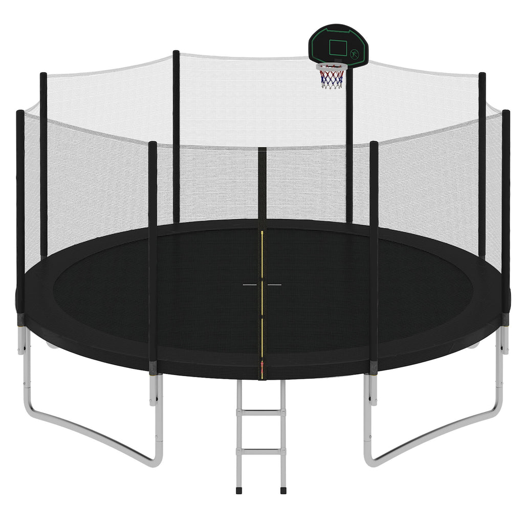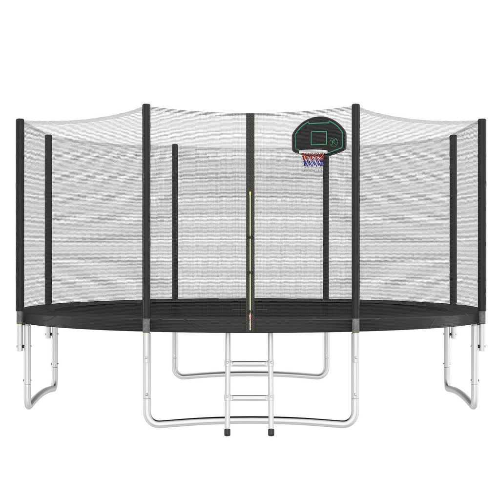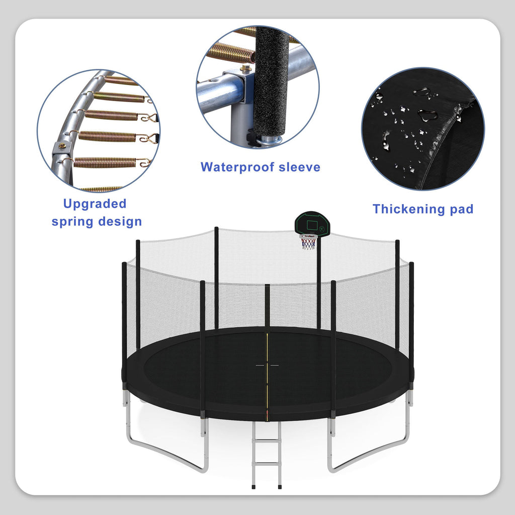 - [Easy Setup] Easy installation with step-by-step instructions. This set comes in 2 boxes and packages may arrive at different times. Our 14FT trampoline assembled dimensions: 14' x 8.53' (Feet).