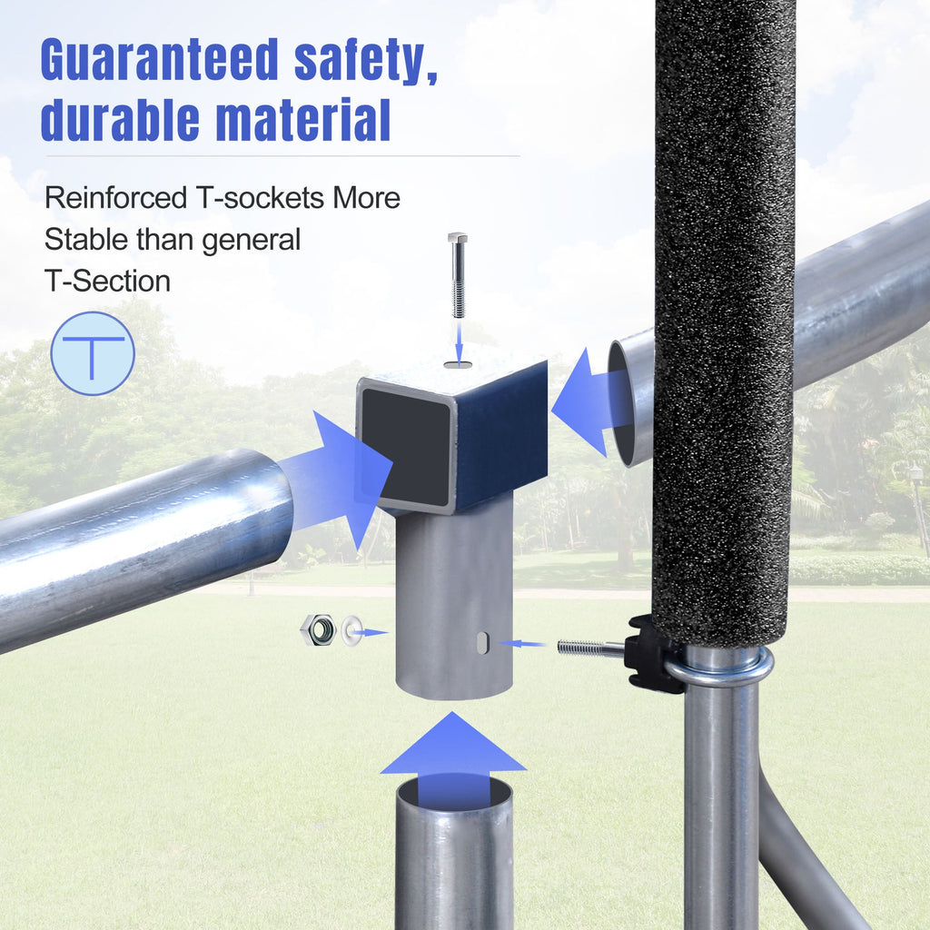 - [Excellent Structure and Materials] The mainframe of the trampoline is supported by high-quality galvanized steel, 4 sets of sturdy leg tubes, and 8 sets of high-quality protection poles to provide maximum bearing capacity and protection, which can fully hold the unlimited vitality of children. The top rails are fixed with specially designed and extra reinforced T-joints to provide excellent stability, and the upgraded W-shaped leg assumes the sturdy base function.