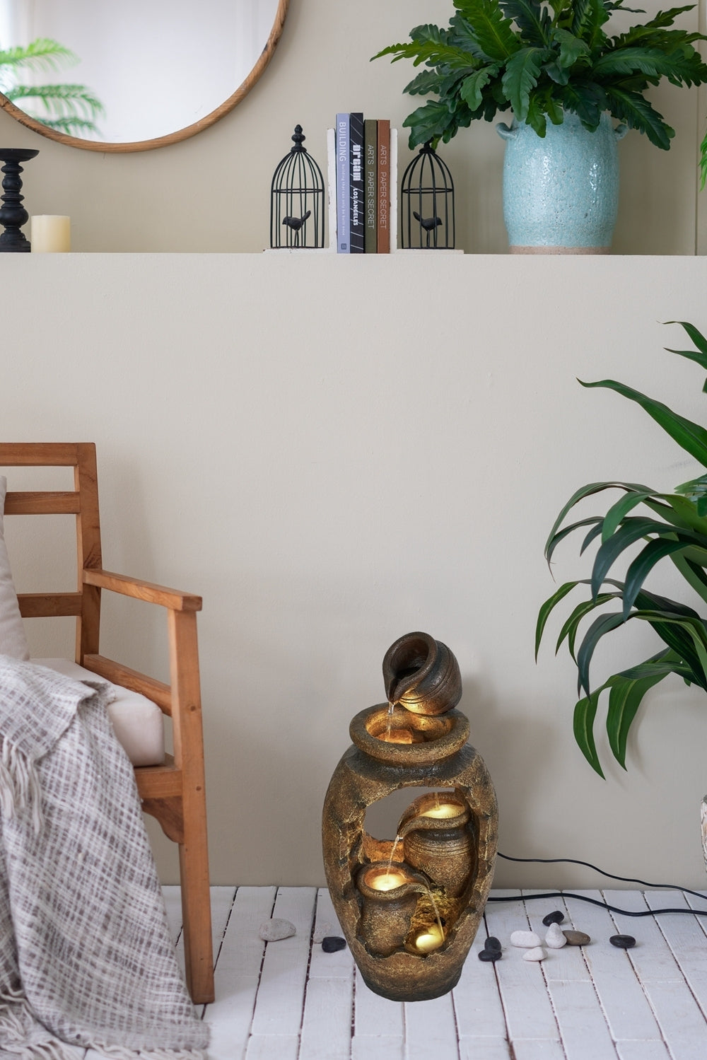 A truly unique display, this decorative fountain features a trio of pot-shaped basins. Together, they create a cascading stream of water that runs calmly through a cracked vase silhouette. With its earthy brown colorway and durable, weather-resistant construction, this fountain will be a long-lasting addition to your decor, complementing almost any style.
