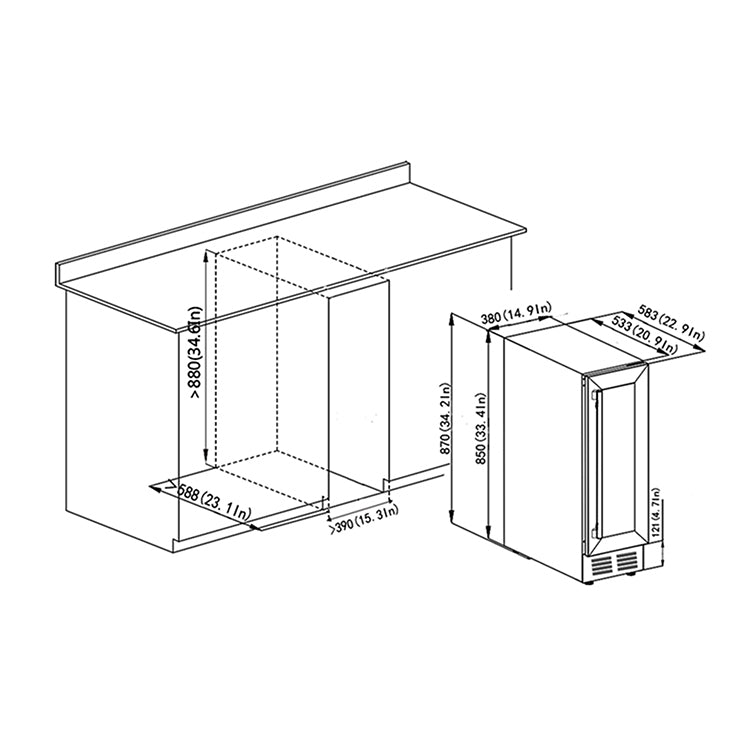 • Fits in Small Spaces: SOTOLA wine cooler is 15" Wide. 22.9"(L) x 14.9"(W) x 33.4"(D). So it fits virtually anywhere in any size home. Can be installed under a counter in kitchen or bar area, or used as a freestanding unit.You could put the unit anywhere you like.