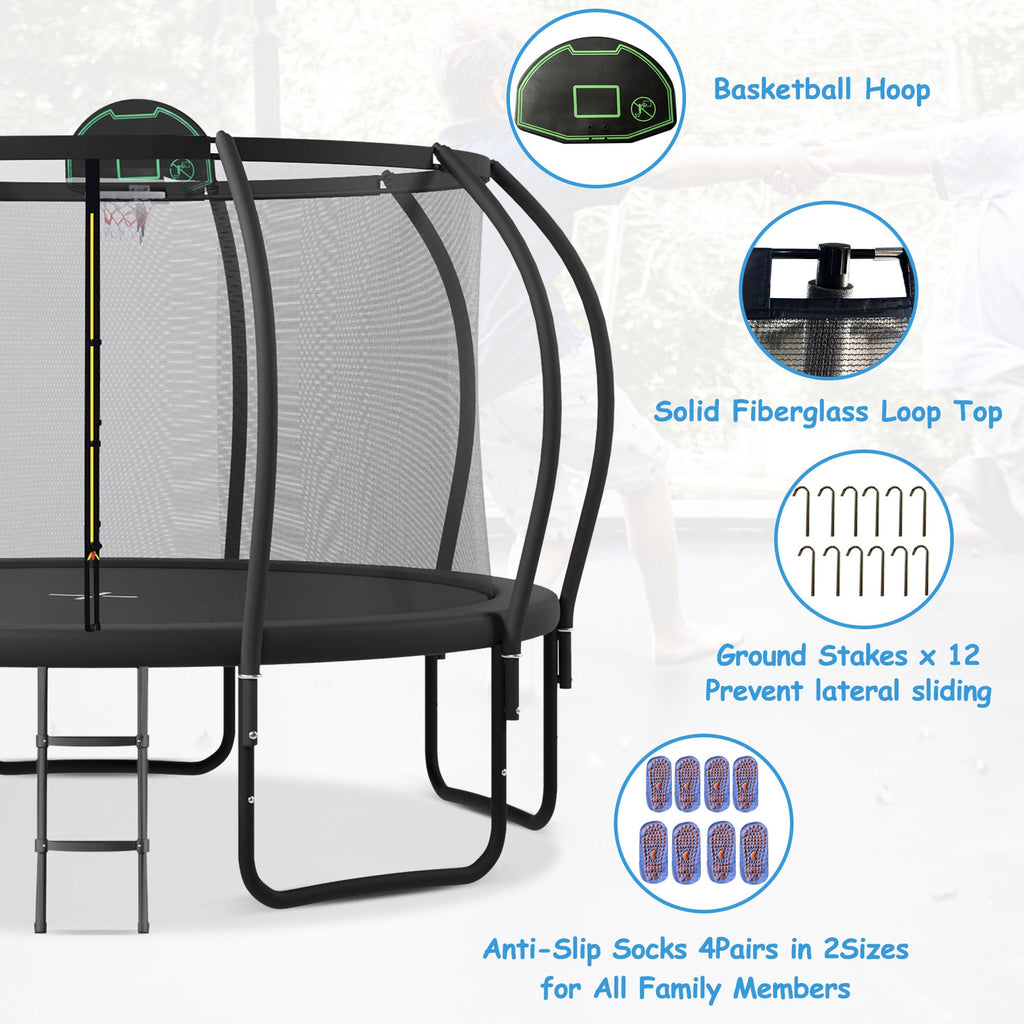15FT Trampoline for Kids with Upgraded ArcPole and Composite TopLoop for Safety Enclosure, Plus Basketball Board and 12 Ground Stakes, Outdoor Recreational Playset Balance Physical Training Trampoline