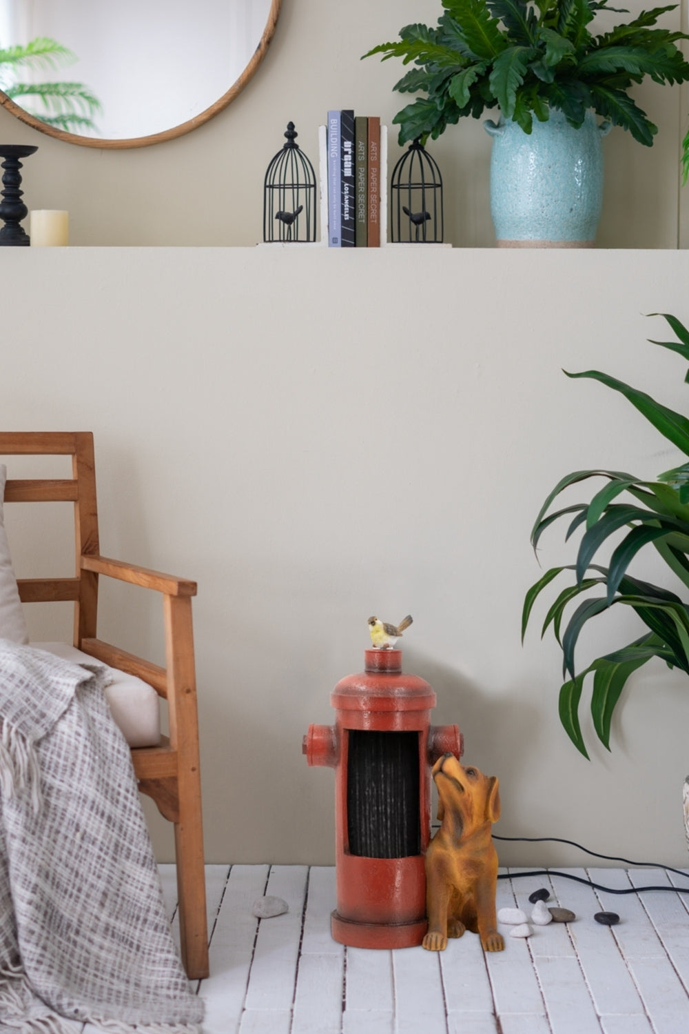 - Crafted from durable, weather-resistant polyresin, this decorative fountain will bring a whimsical touch of tranquility to your garden or patio. Featuring a classically designed red fire hydrant, a playful sitting dog by the side, and a delicate bird perched at the head, the unique, colorful visuals are sure to draw the eye.