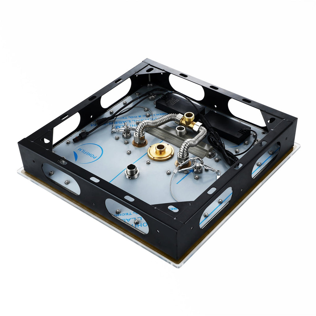2. Top Shower Head: The flush-mounted ceiling shower head measures 16" x 16" and offers four functions: rainfall, waterfall, mist, and hydro-massage. It also features 64 LED lights and Bluetooth music, which can be turned on or off while showering. The LED lights can be controlled by a remote panel, while music can be managed using your cell phone.