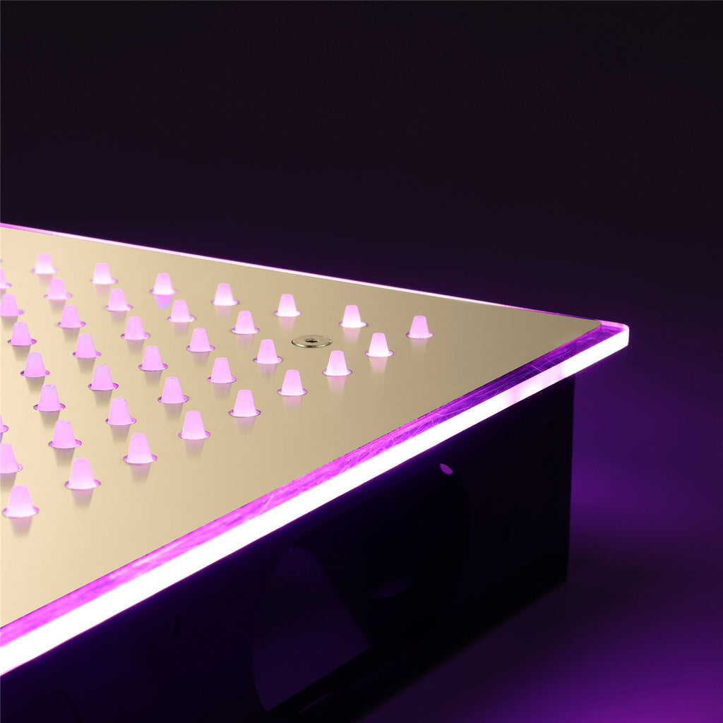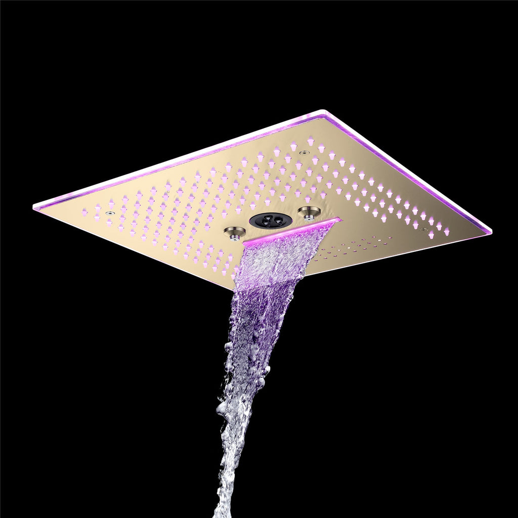 16-Inch Brushed Gold Flush-Mounted Rainfall, Waterfall, Mist, Hydro-Massage Shower Head with 64 LED Lights and Bluetooth Music - 5-Way Thermostatic Shower Faucet With Optional Digital Display
