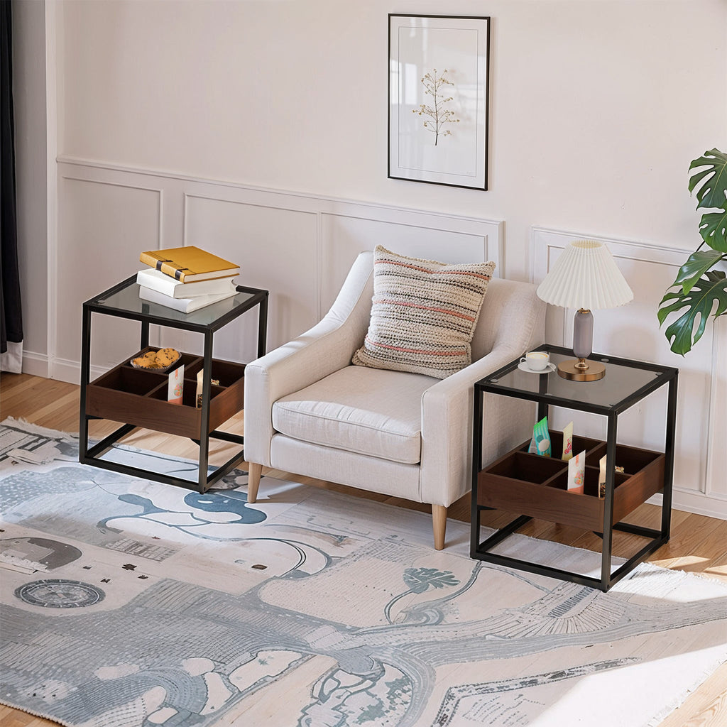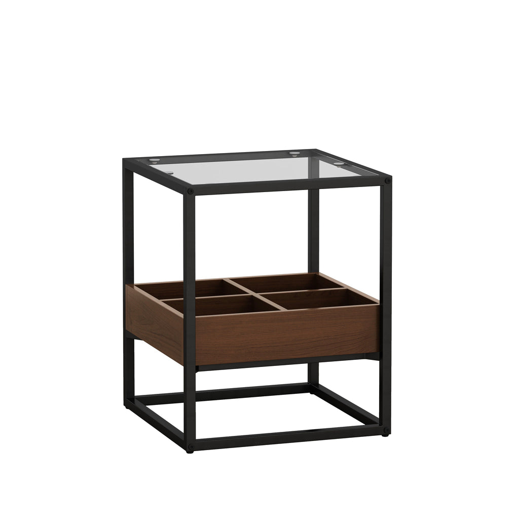 • 2.High quality materials: This square side table is made of safety tempered glass surface and high-quality density board, combined with a metal structure, adding additional fashionable elements to your home decoration. The desktop can bear 33 pounds, and the storage compartment is made of high-quality density board. Stainless steel rods and high-quality metal legs ensure high load capacity and stability, making it durable.