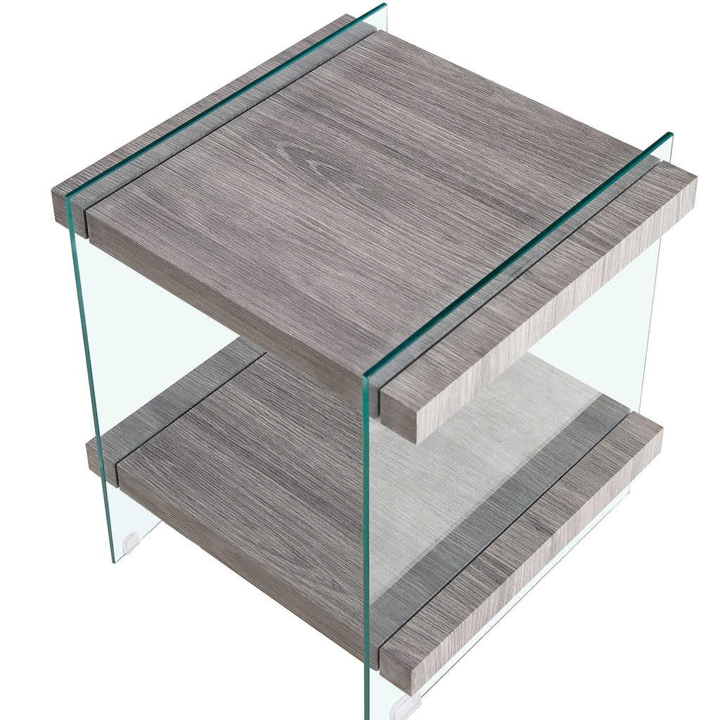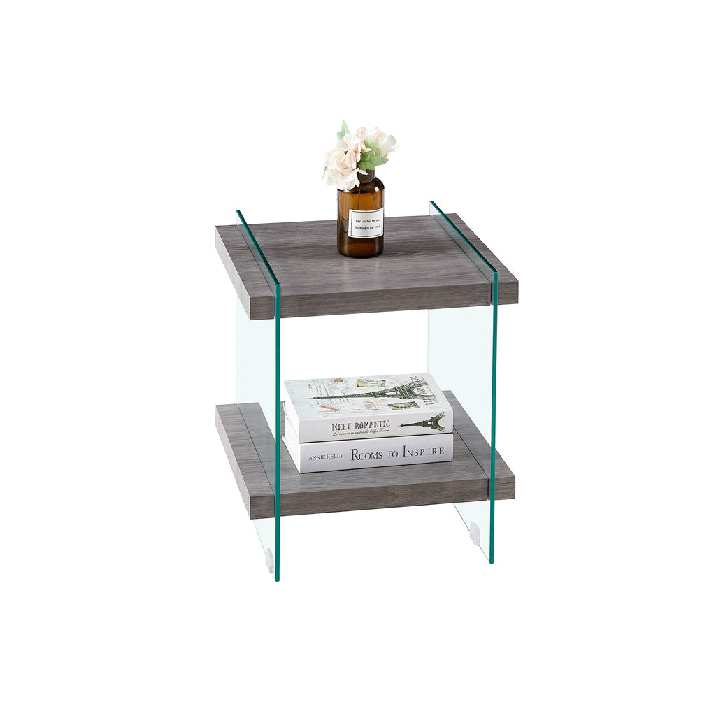 1.Product dimensions: 17.72"*17.72"*19.69" Net weight: 35.64lbs Load-bearing capacity:220lbs 2.High-Quality Material: The table legs are made of 8mm tempered glass and are highly durable. The use of tempered glass ensures that the table is resistant to scratches and wear, making it a reliable and long-lasting piece of furniture. 3.Two-Tier Design: The table has two tiers made of MDF, which provides ample space for storage and display. This design is not only functional but also adds to the sleek and modern look of the table. 4.Sleek and Elegant Appearance: The table's simple and refined design makes it an attractive addition to any living space. The combination of glass and MDF creates a stylish and contemporary look that is sure to impress. 5.Non-slip feature: The table features PVC material on the bottom of its glass legs, which provides a non-slip function, preventing accidents and increasing safety. 6.Easy assembly: The table is easy to assemble, with all hardware and instructions included in the package. The simple and straightforward assembly process makes it convenient for customers to put together and enjoy the table in no time.