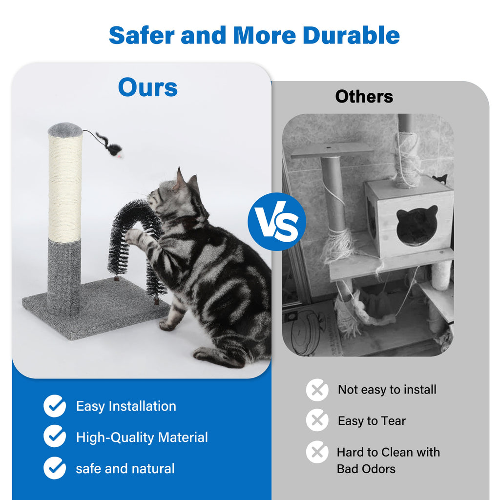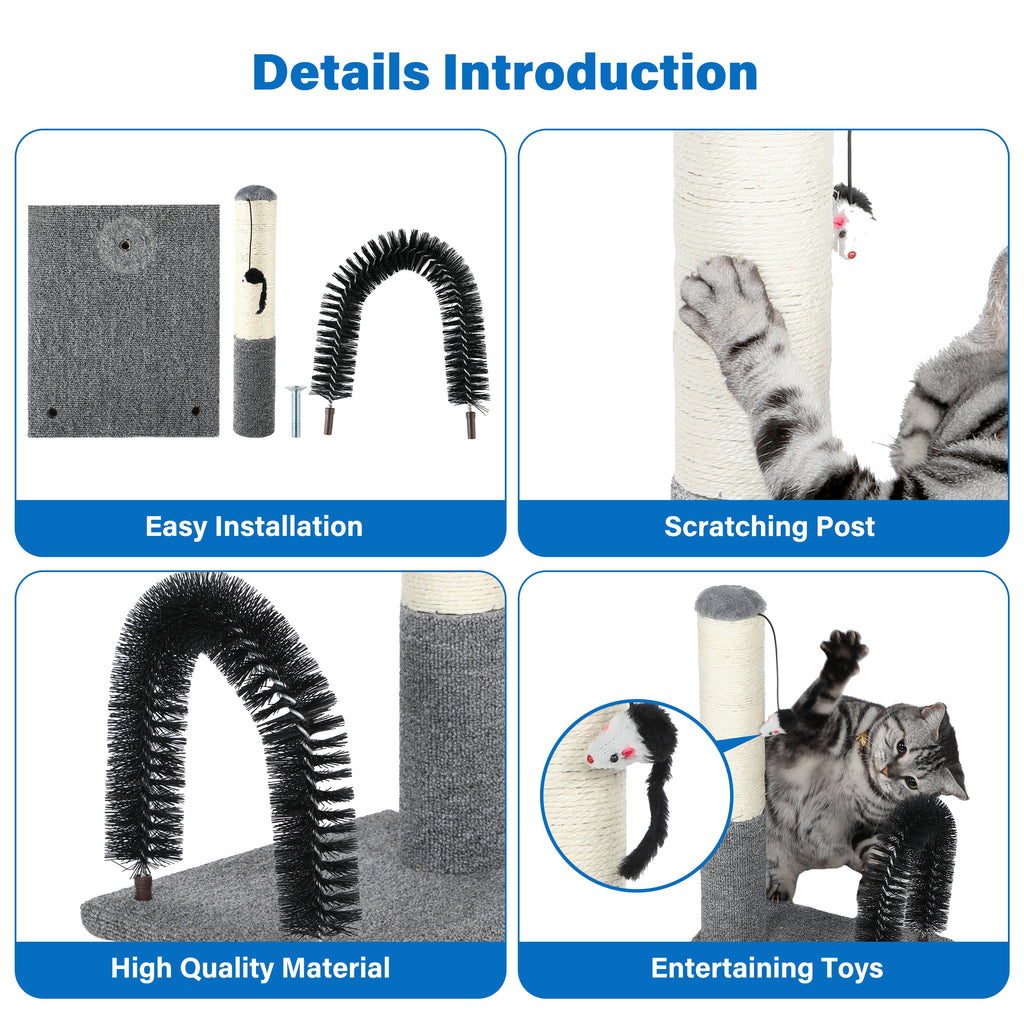 • 【3 IN 1 Cat Scratcher Post Pad】Cat Grooming Brush, , Sisal Scratching Post, Entertaining Toys. For Detachable Arch Cat Self Groomer design, it can help stop hair shedding everywhere. Removable Arch Cat brush can also be used as a cats back grooming massager. Sisal scratching pad and post can help your keep your cat's paw healthy. Spring Ball with Bell, as one of cat's favorite toys can attract your furry baby’s attention, making your kitty happy and healthy.