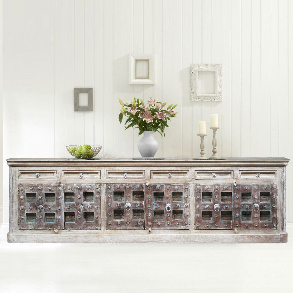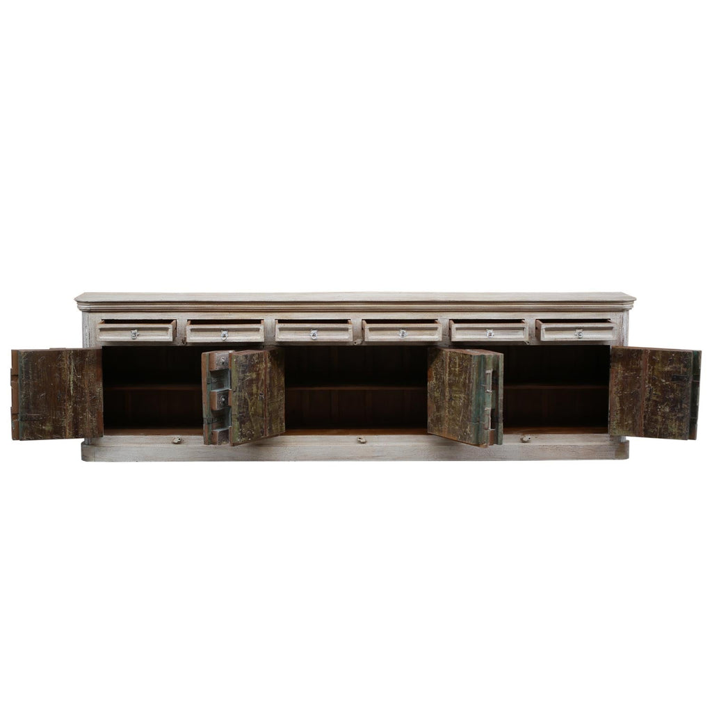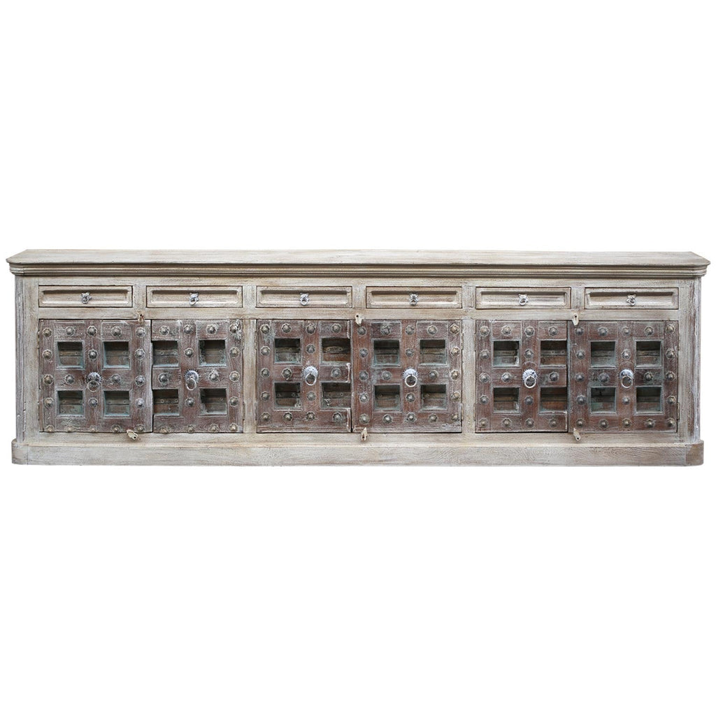 Make a statement with this strikingly unique wood sideboard that illustrates a beautiful blend of new and old styles. This solid wood buffet cabinet is eco-friendly and sustainably crafted from an upcycled 1800s antique teak wood door. Expertly hand-carved by artisans, it features four 3 inches thick doors hammered with nail heads and metal straps for additional sturdiness. With the original hardware left untouched, it has a solid plinth base and slightly rounded cornice tops with smooth edges to give it an elegantly stately look. The body of this distinctive 131 inches wide sideboard is constructed from mango wood and features six drawers highlighting its ancient and ornate vibe with its light tone. Featuring farmhouse style, this delightful piece is hand distressed to showcase its graceful white, gray and natural wood tones from underneath that are perfect for any modern interior home. This one-of-a-kind sideboard can be used as a TV console in your living room to store books, games, or even blankets. Alternatively, this furniture piece would be perfect as a dining room buffet and can be used to house your dinnerware, silverware, and tableware in its 6 drawers and 6 inner shelves and the vast tabletop can come in handy to host a buffet party.