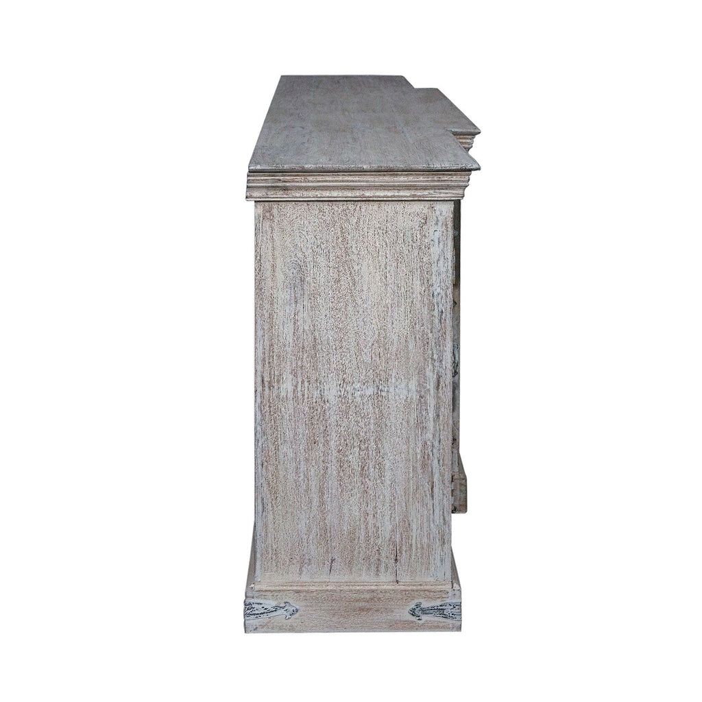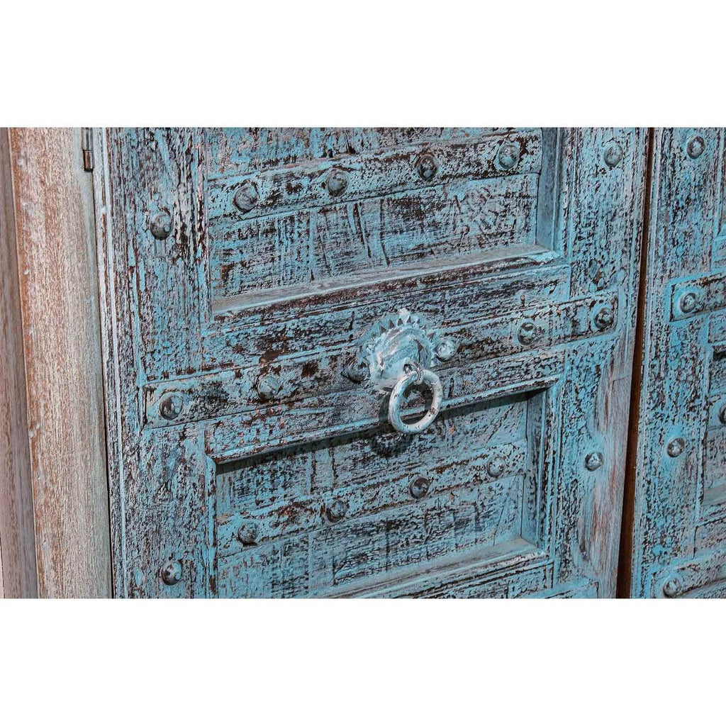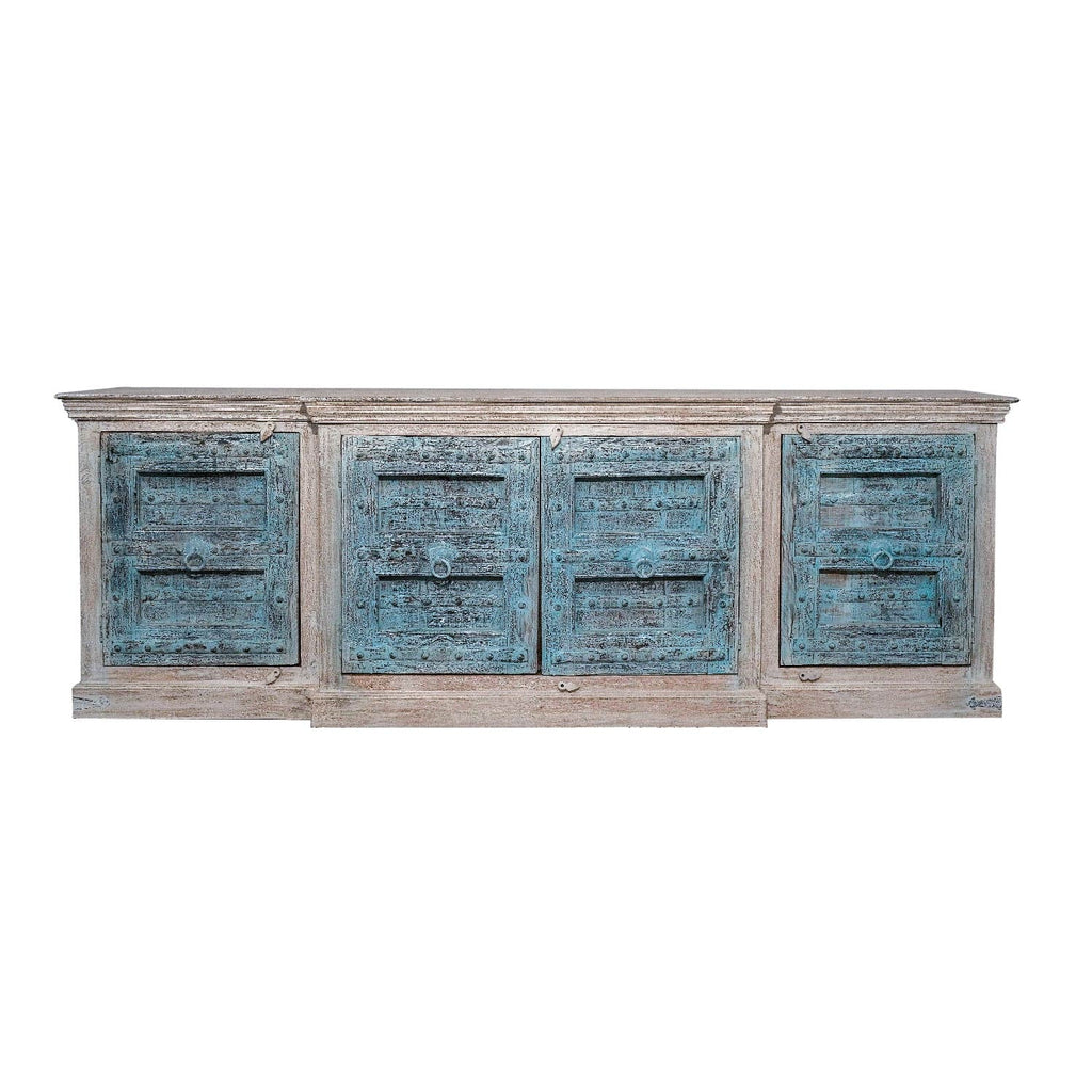 Create a vivacious ambiance at your home and let the distinctive colors of your interior give prominence to this long sideboard. Being naturally aged and distressed, this solid wood beauty uses a 1900s teak wood door with original nail heads and pulls to design this opus magnum. With a dual-tone, the original blue paint here is undeniably the gravitational factor that will astound anyone who sees it. The white paint of this mango wood structure contrasts and accentuates its comprehensive appearance. Place this 108 inches extra long buffet in your dining room to house your serving dishes, tablecloths, napkins in its 6 compartments, or as a entryway credenza, and decorate it with a silver candelabra or a lamp for a warm traditional look. You can also use this unique sideboard in the living room as a TV console and house your media accessories; or to store books and files in your home office. A fusion of elegance and efficiency, this ranch style sideboard will complement both modern and rustic homes.