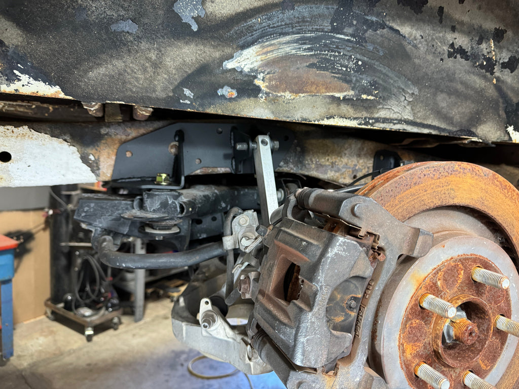 This kit is designed to allow the S-550 / S-650 suspension to bolt to a F-100 using the factory subframe mounts on the 2015-2023 Mustang S-550 and 2024+ S-650 rear suspension. It also integrates mounts for a 12” coil-over. This setup allows for an unmodified bed and much lower than stock ride height, as well as modern, brakes, suspension, and a limited slip differential. The kit uses the leaf spring bracket holes to locate the assembly (be careful not to mangle the holes when you are removing the factory rivets!) and bolts to the side and bottom of the frame rails. You will need to drill some holes for installation, but the brackets act as templates to keep the install simple and straight forward.