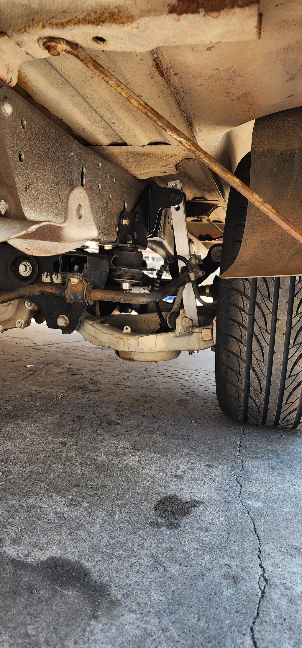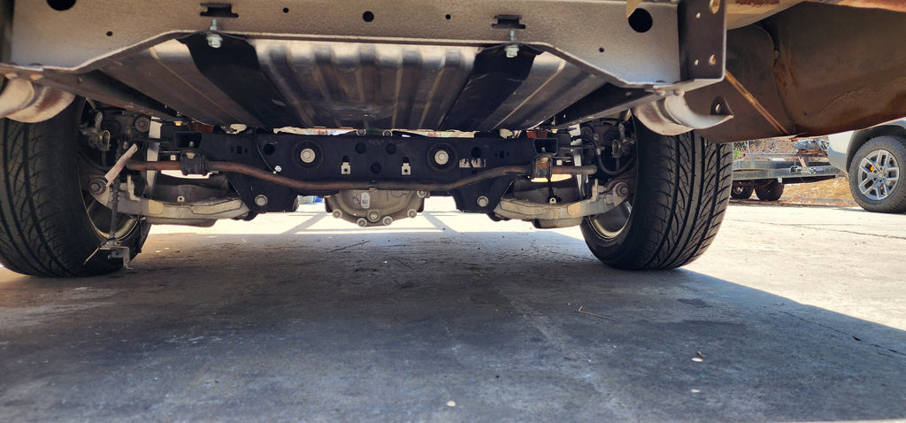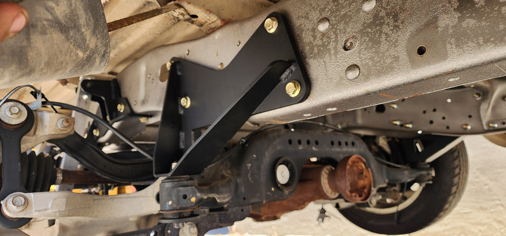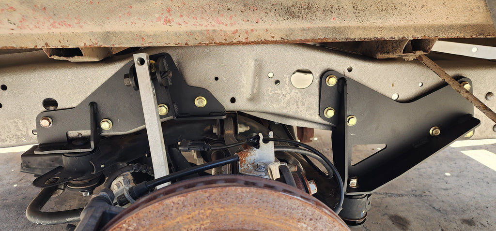 This kit is designed to allow the S-550 / S-650 suspension to bolt to a F-100 (38" wide rear frame) using the factory subframe mounts on the 2014-2023 Mustang S-550 and 2024+ S-650 rear suspension. It also integrates mounts for a 12” coil-over (We recommend 300-350 lb spring rate.). This setup allows for an unmodified bed and much lower than stock ride height, as well as modern, brakes, suspension, and a limited slip differential. The kit uses the leaf spring bracket holes to locate the assembly (be careful not to mangle the holes when you are removing the factory rivets!) and bolts to the side and bottom of the frame rails. You will need to drill some holes for installation, but the brackets act as templates to keep the install simple and straight forward.