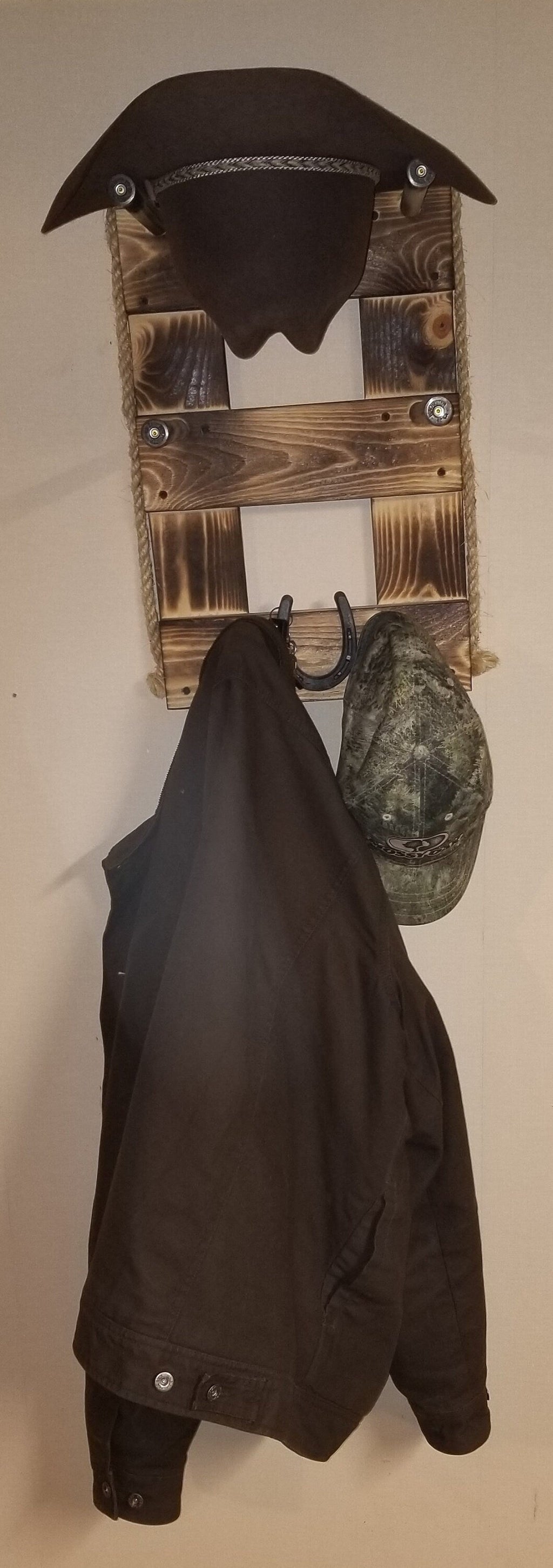 This wall-mounted beauty is the perfect solution for keeping your hats clean, proudly on display, and neatly out of the way. Best of all, you can make it truly yours! Choose your favorite stain to match your style and select either rustic rope or rugged barbed wire hanging accents.