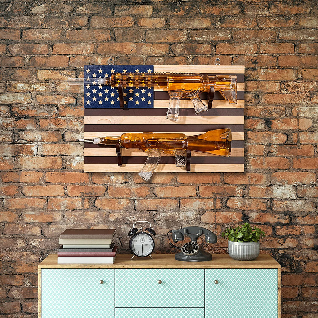 • The greatest debate in America. Whose gun is better? Show your love for both with this Wall Mount Whiskey Decanter Set, featuring an AR15 and AK47 decanter. Proudly display on your wall with the built-in mounting screws to show whose side you're on. Incredibly detailed and features an elegant US Flag Stand. The Whiskey Gun Decanter set is a great addition to any bar or man cave. Display these on a wall rack, shelf or mantle with pride.