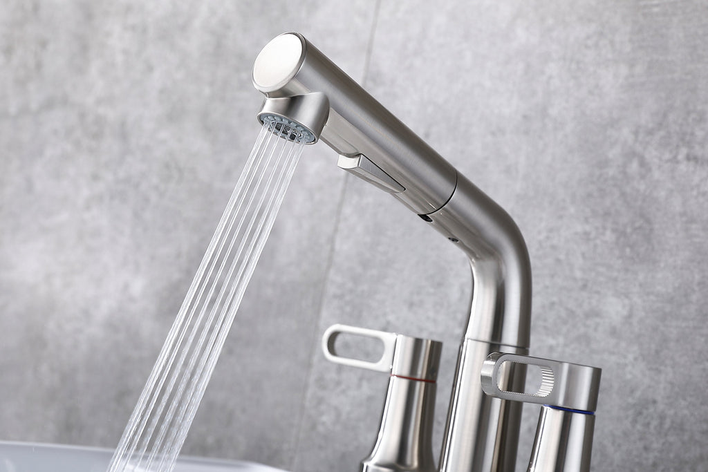 2 Handle Bathroom Sink Faucet 3 Hole with Pull Out Sprayer, Centerset Bathroom Faucets, 4 Inch Centerset Bathroom Faucet with Retractable Hose, Hot and Cold Water Mixing Faucet