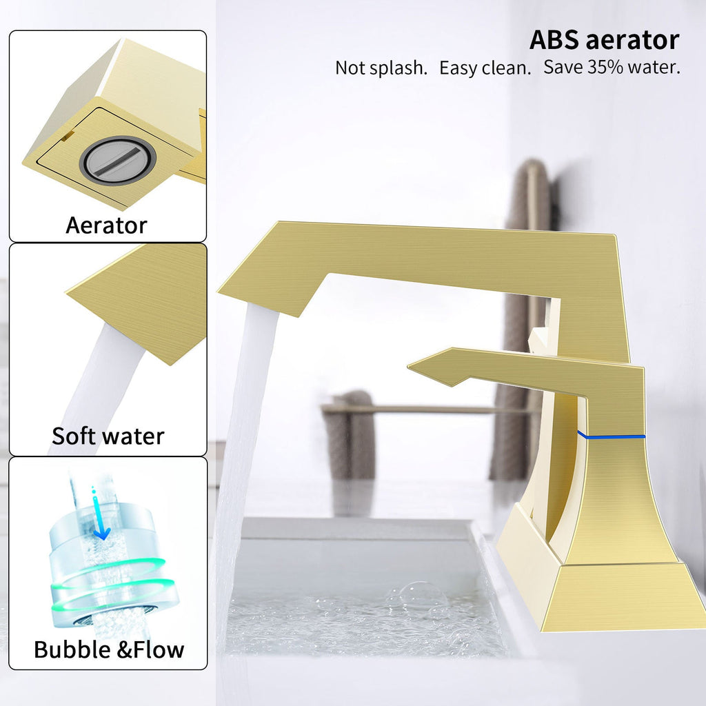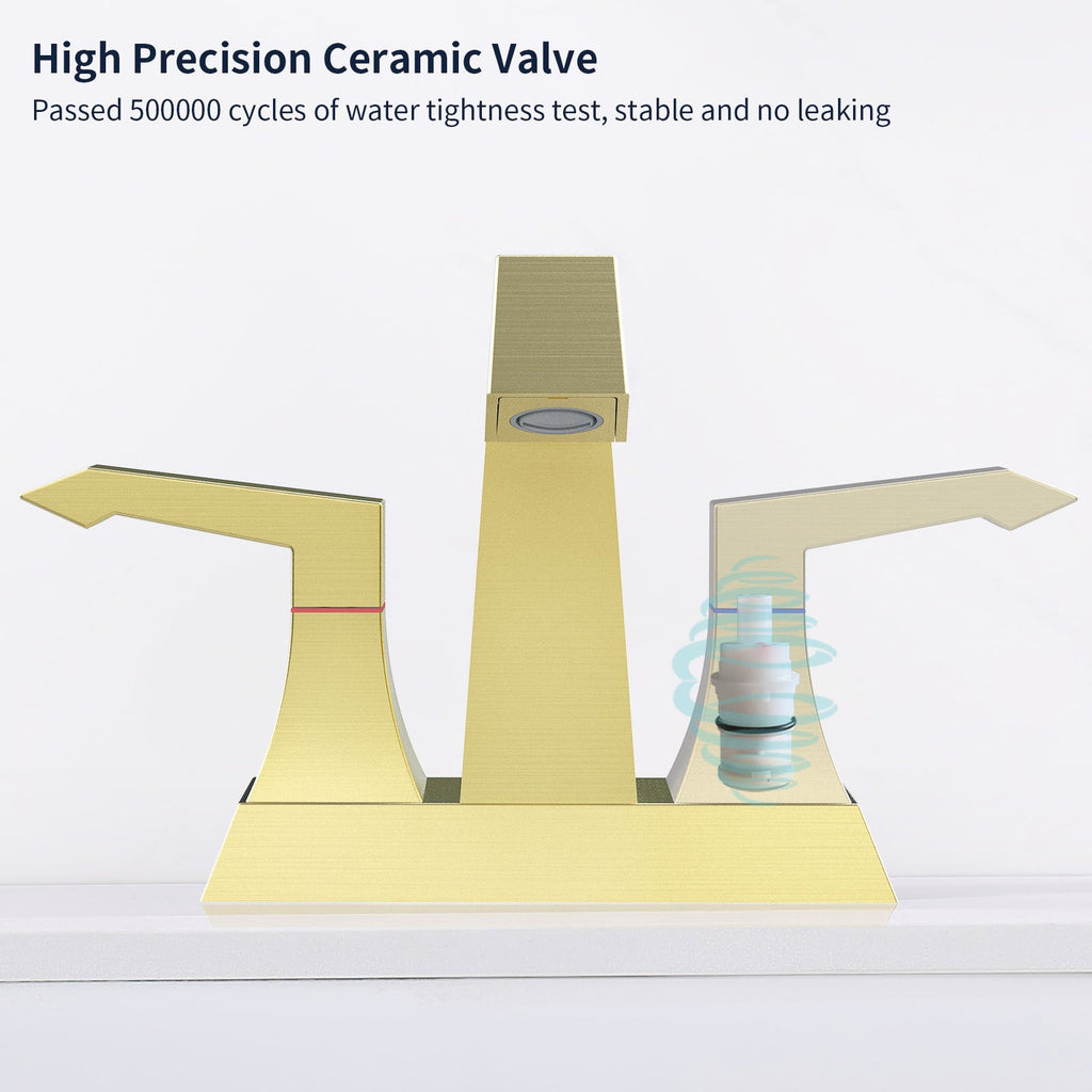 Brushed gold finish --- All premium surfaces resist rust, corrosion and tarnish. Also they resist fingerprints and water spots for neat looking. The faucet provides an ABS aerated stream of up to 1.2 gallons per minute. High precision ceramic valve --- The ceramic valve core of this bathroom sink faucet gold has undergone 500000 cycles of water tightness testing stable and no leaking. And is more durable than other bathroom sink faucets on the market. Two-handle design --- Two handle metal lever design for precise control in both volume and water temperature. Minimalist modern design makes your bathroom more elegant. GELE is dedicated to designing and delivering good products that last a lifetime. Easy to install --- This brushed gold bathroom sink faucet is designed to fit 3-hole, 4"centerset configurations, and comes with step-by-step instruction with quick connect for easy installation. Accessories Included: Pop-up drain & water Inlet hoses. Lifetime limited warranty --- Lifetime limited warranty covers parts and finish defects. If any problem, welcome to contact with us. We are the source factory of faucets. Design, R & D, precision casting, assembly and packaging are all completed by our factory. We are dedicated to designing and delivering good products. Your satisfaction is always our top priority.