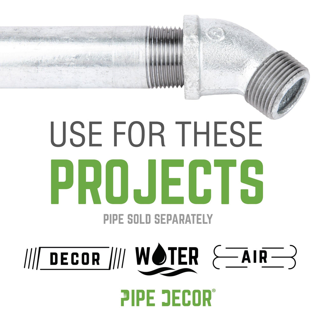 Add a modern look to your DIY projects with galvanized 45-degree angle street elbows. Create a one-of-a-kind desk, coffee table, or a piece of art and get that angle just right. Galvanized fittings are silver in color with a shiny finish that brings a clean, polished look to your pipe furniture. Our fittings are made with durable, industrial-grade malleable iron. Fittings are 100% authentic and are made to stand the test of time. You will know PIPE DECOR parts and accessories when you hold them. Beauty and beast. Strength and style. These are real industrial fittings for your decorations and designs. Accept no substitutes. Extra pieces and accessories are available for your custom projects and expansions. Plug and play as desired.