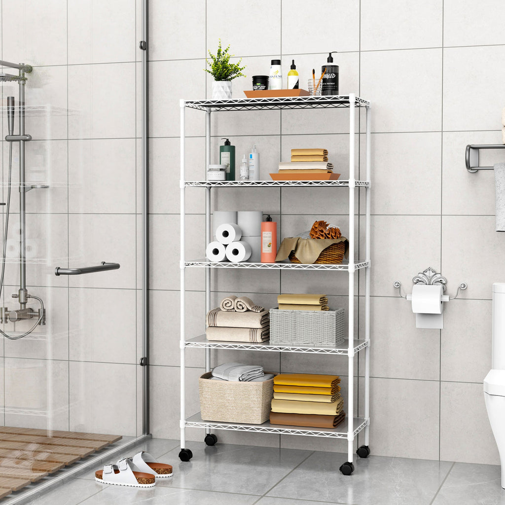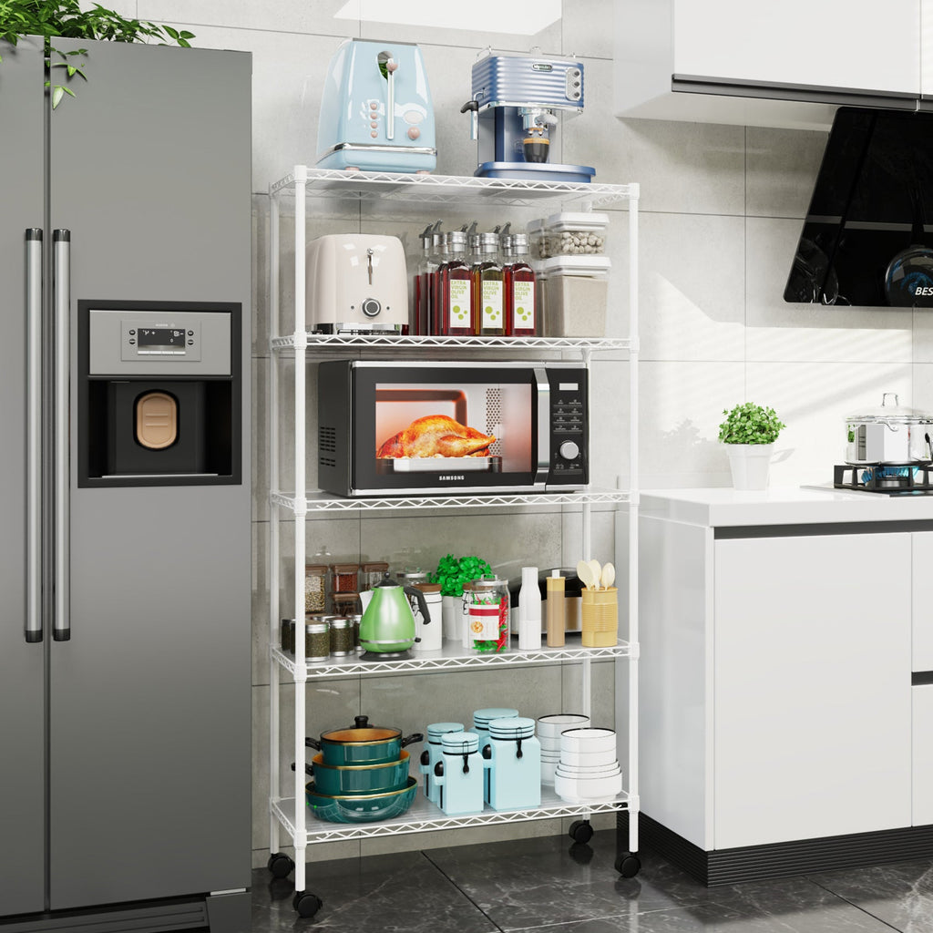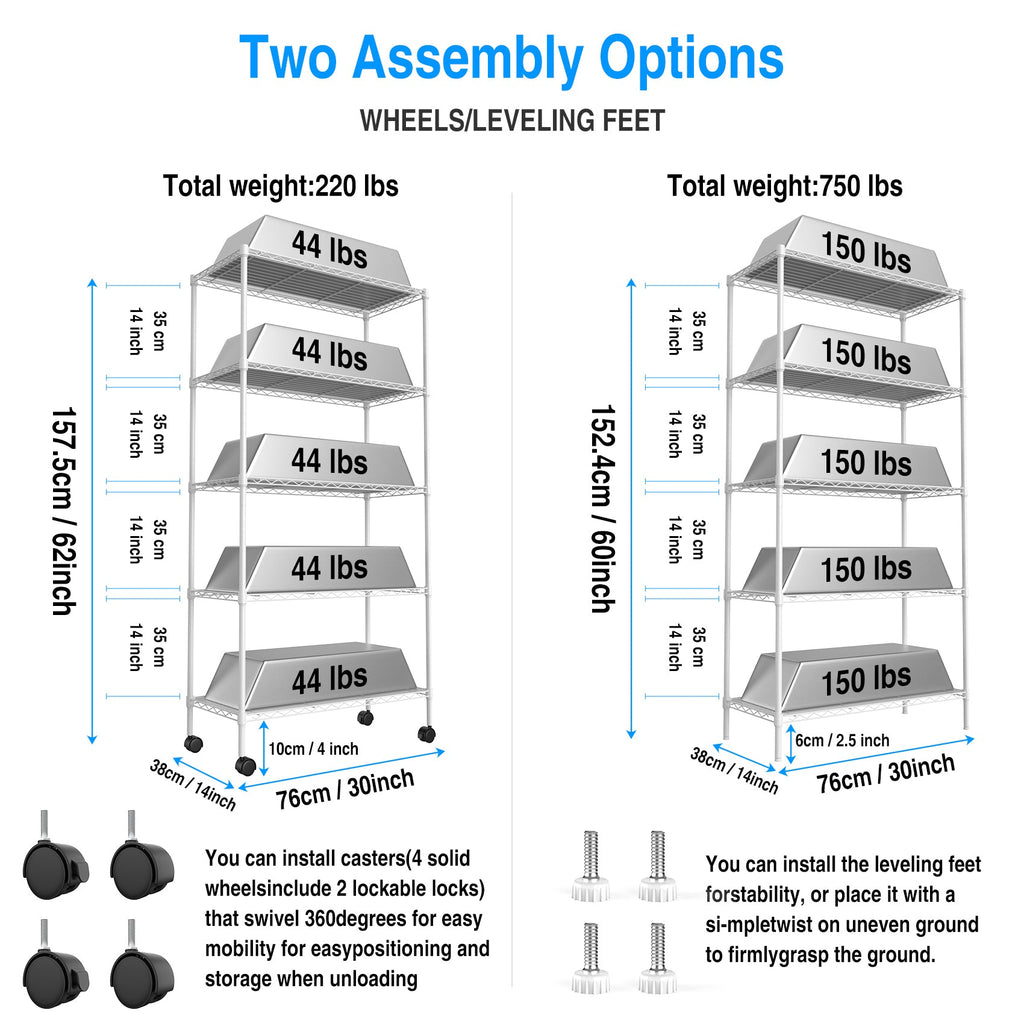 - [EASY MOVEMENT] - 5 tier garage shelves have 4 leveling feet, 4 50mm nylon wheels(2 lockable). Wire rack on wheels can be easily positioned in supermarkets, garages, closets, kitchens, porch, pantry, etc. Height-adjustable leveling feet can be placed on uneven ground- simply twist to stabilize. Non-slip, will not scratch ground.
