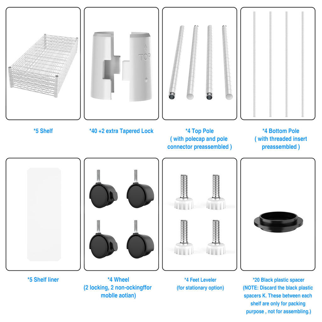 - [EXTREMELY DURABLE] - Wire shelving made of heavy steel, it has excellent rust resistance and oxidation resistance. Our wire shelf liner is crafted to provide unparalleled quality, longevity, function and beauty. Better quality thicker than the competition. The 5 tier shelf unit passed NSF certified, safe and reliable. Storage rack are perfect addition to home, office.