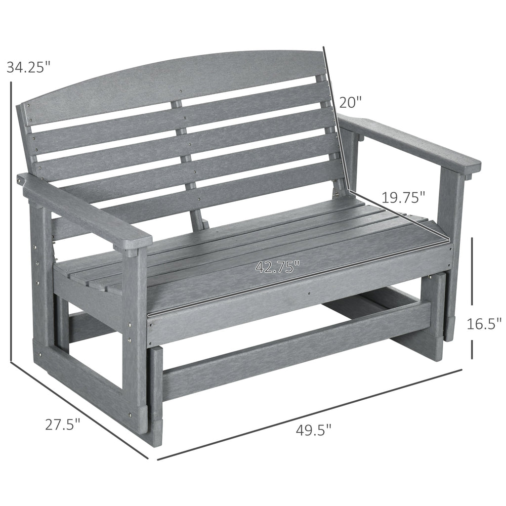 - Loveseat Patio Glider Bench Info: Overall Dimensions: 49.5" W x 28.75" D x 34.25" H. Weight Capacity: 528 lbs. Assembly required.