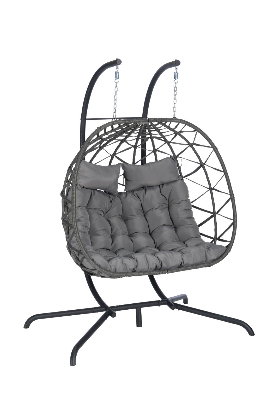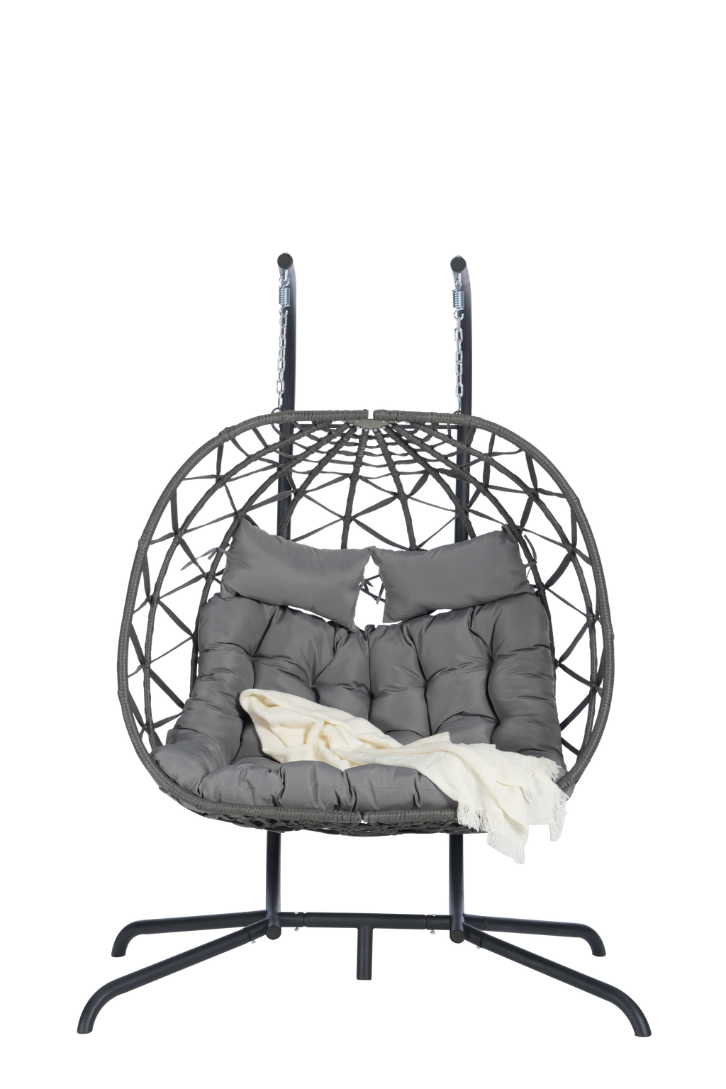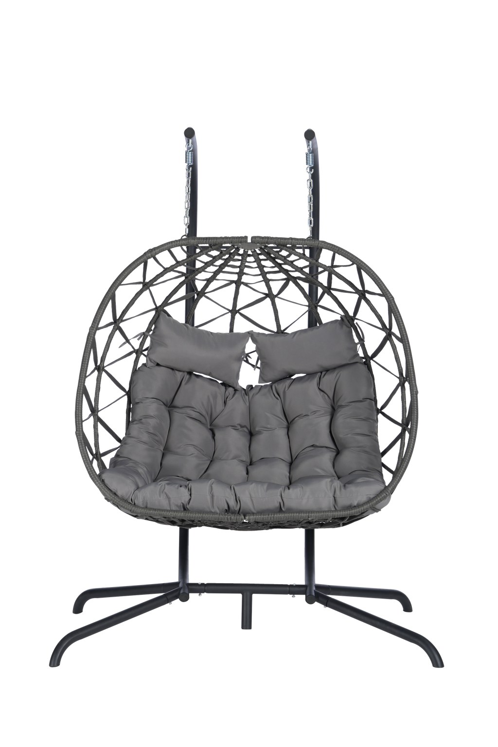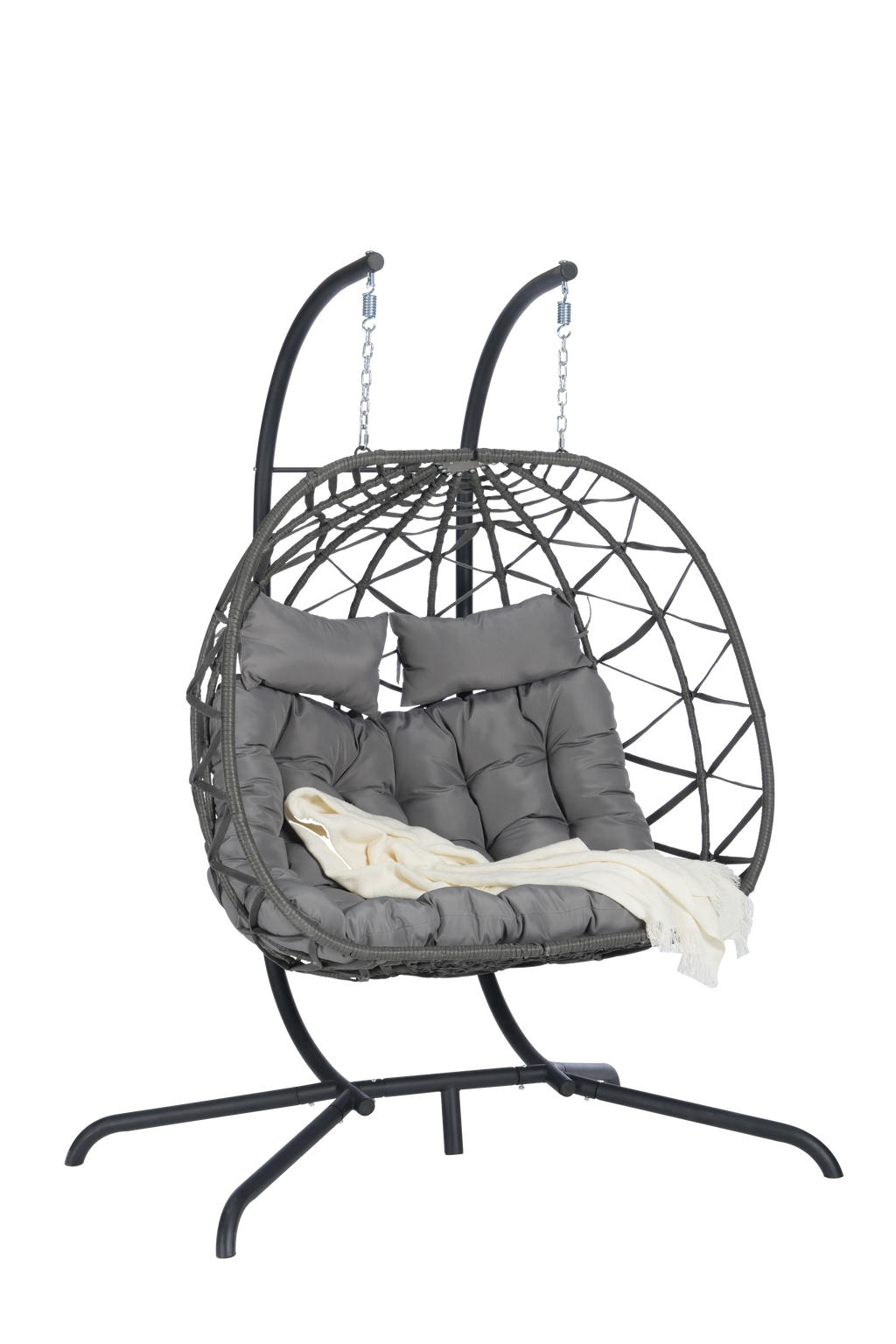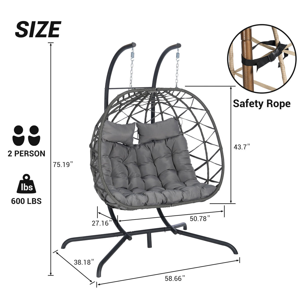 OUTDOOR PE RATTAN 2 PERSON SWING CHAIR EGG CHAIR WITH CUSHION Product size Overall Size:58.66*38.18*75.19" Basket Size :50.78*27.16*43.7" Net weight: 80 lbs Gross weight: 81.4 lbs Load:600 lbs Package:1 carton box cushion color: Light Gray rattan color: Deep Gray steel material the cushion can be dismountable Product Features 1. High-quality durable iron frame, UV-Resistant, & rust resistance great for outdoor use 2. Hand-woven and handcrafted Wicker material by outstanding craftsmen 3. Cushion made from outdoor fabric and filled with soft Cotton, breathable design 4. Supported by a stand constructed from strong and durable iron MODULAR WICKER SECTIONAL Highlights 1.High-quality durable iron frame, UV-Resistant, & rust resistance great for outdoor use 2.Hand-woven and handcrafted Wicker material by outstanding craftsmen 3.Cushion made from outdoor fabric and filled with soft Cotton, breathable design 4.Supported by a stand constructed from strong and durable iron 5.Fits 2 people and enough space for any position that you like 6.Iron Spreader Bar Included 7.Simple Assembly Required This porch swing chair that fits 2 people comfortably was built to last in the outdoors with its strong durable iron frame it will be perfect for all weathers. Sit in luxurious comfort while surrounded by the peace and beauty of your backyard, or enjoy a good book indoors with this comfortable hanging chair. Remark: These photo were taken from real products. However, due to lighting and display you may see slightly color difference from picture. This is inevitable. If customer complaint about the color issue, we will not take any responsibility. Thank you for your kind understanding.