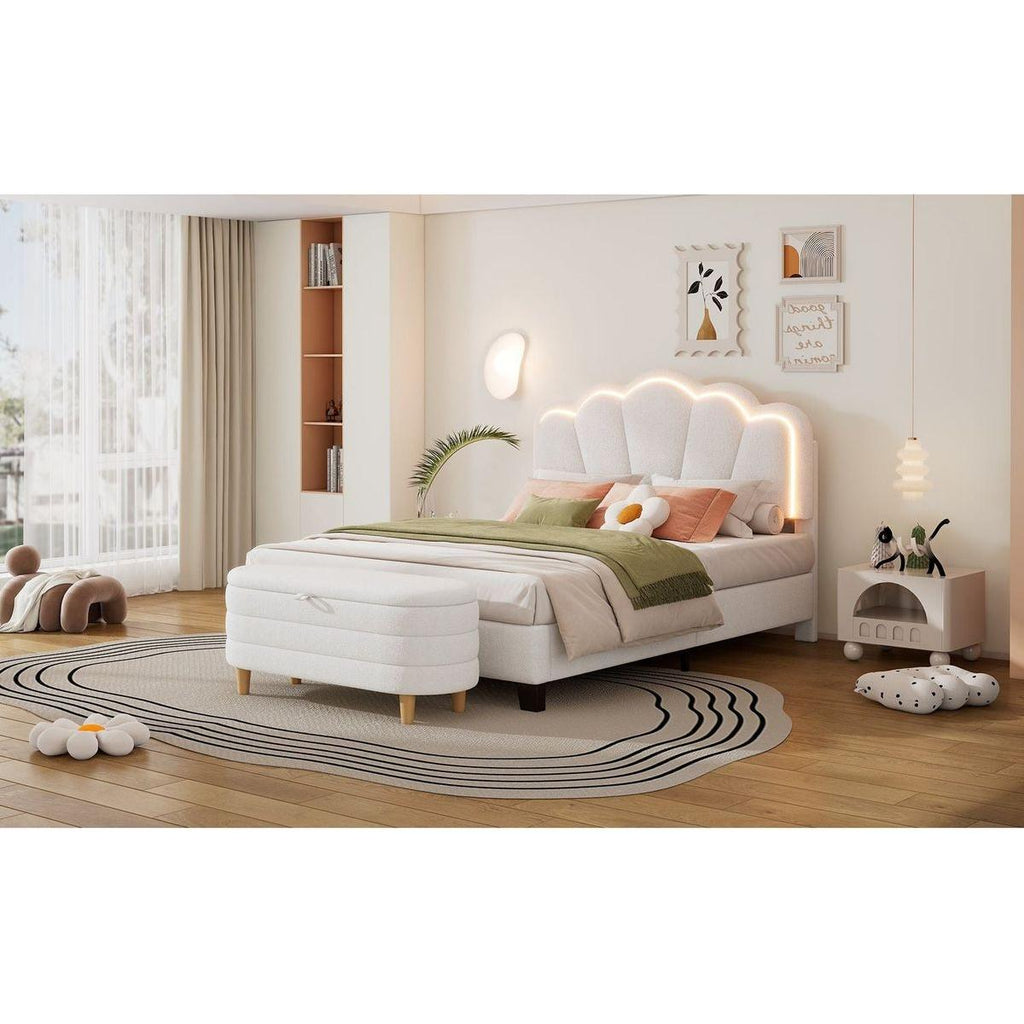 2-Pieces Bedroom Sets Twin Size Upholstered LED Platform Bed with Storage Ottoman, White