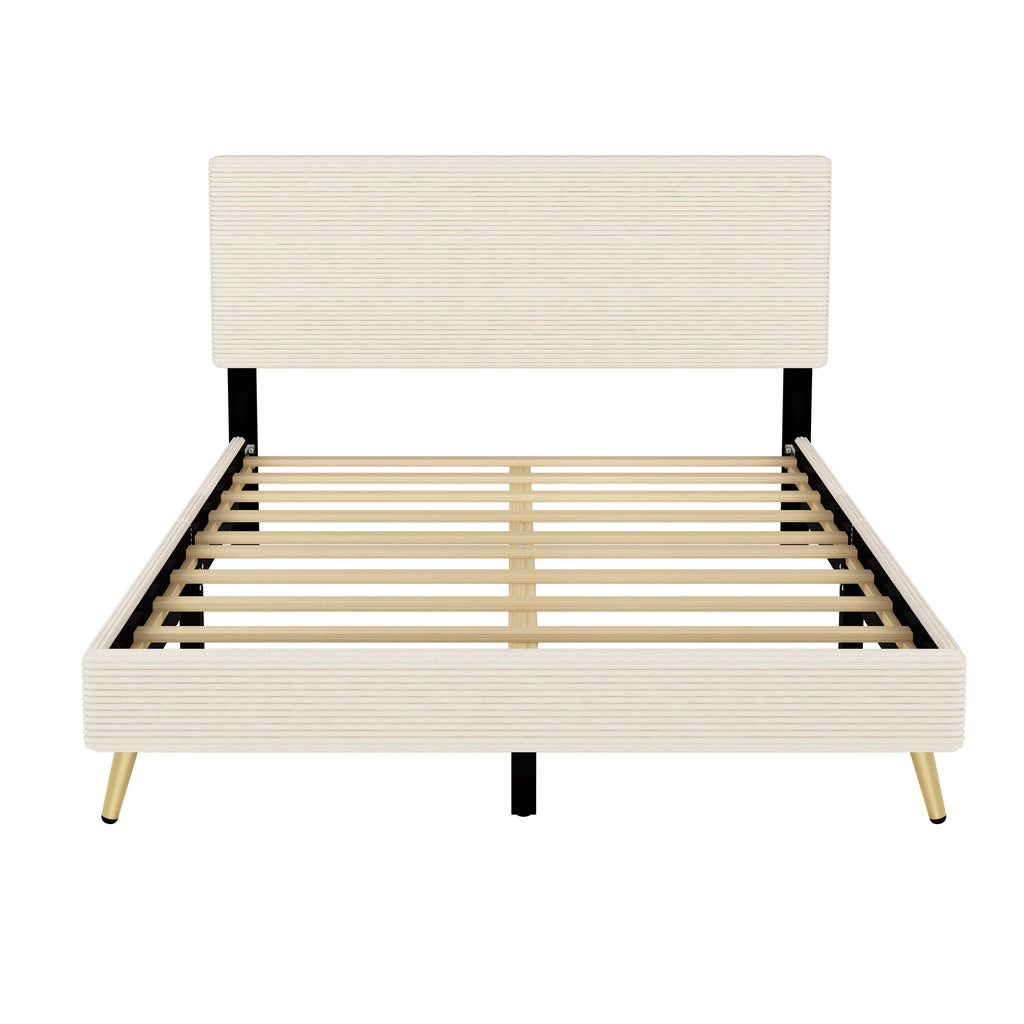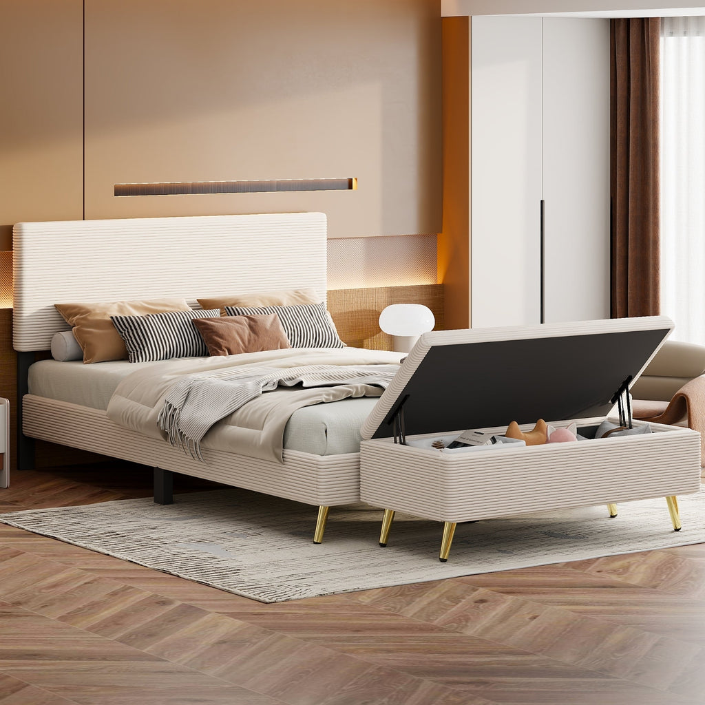 2 Pieces Bedroom Sets Queen Size Upholstered Bed Frame, Modern Corduroy Storage Ottoman,Beige