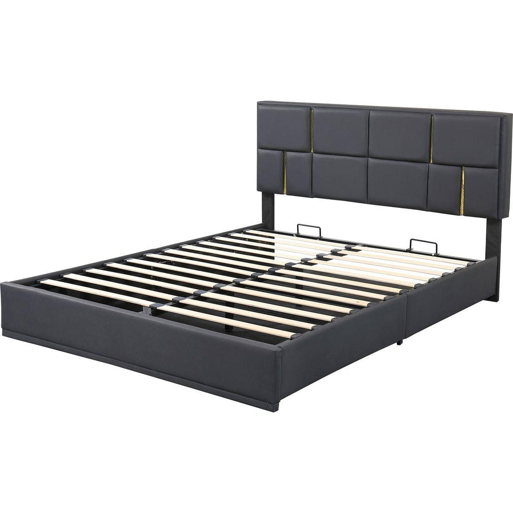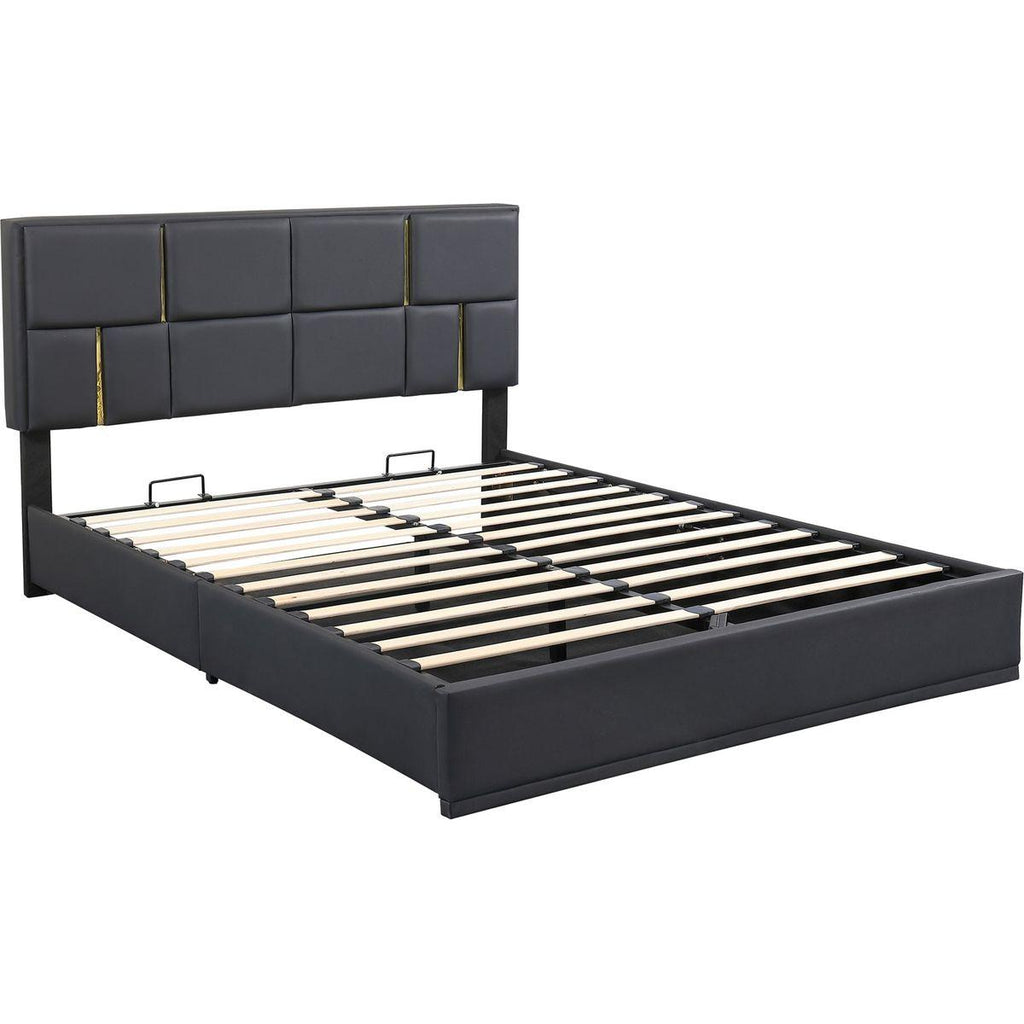 Upholstered in carefully-selected soft fabric, with gold decoration on the headboard, this platform bed not only suits any home décor, but is timeless in its design. The soft textile bedhead creates coziness, while the single color of the design creates versatility.The hydraulic storage system underneath the mattress is perfect for you to store quilts, bed sheets and other necessities. Storage ottoman provides ample storage space for organizing pillows, blankets or magazines neatly. Upholstered in skin-friendly, breathable, and wear-resistant fabric which provides comfortable support for reading or lounging in bed. Functional and aesthetic, this bed will enhance any bedroom.