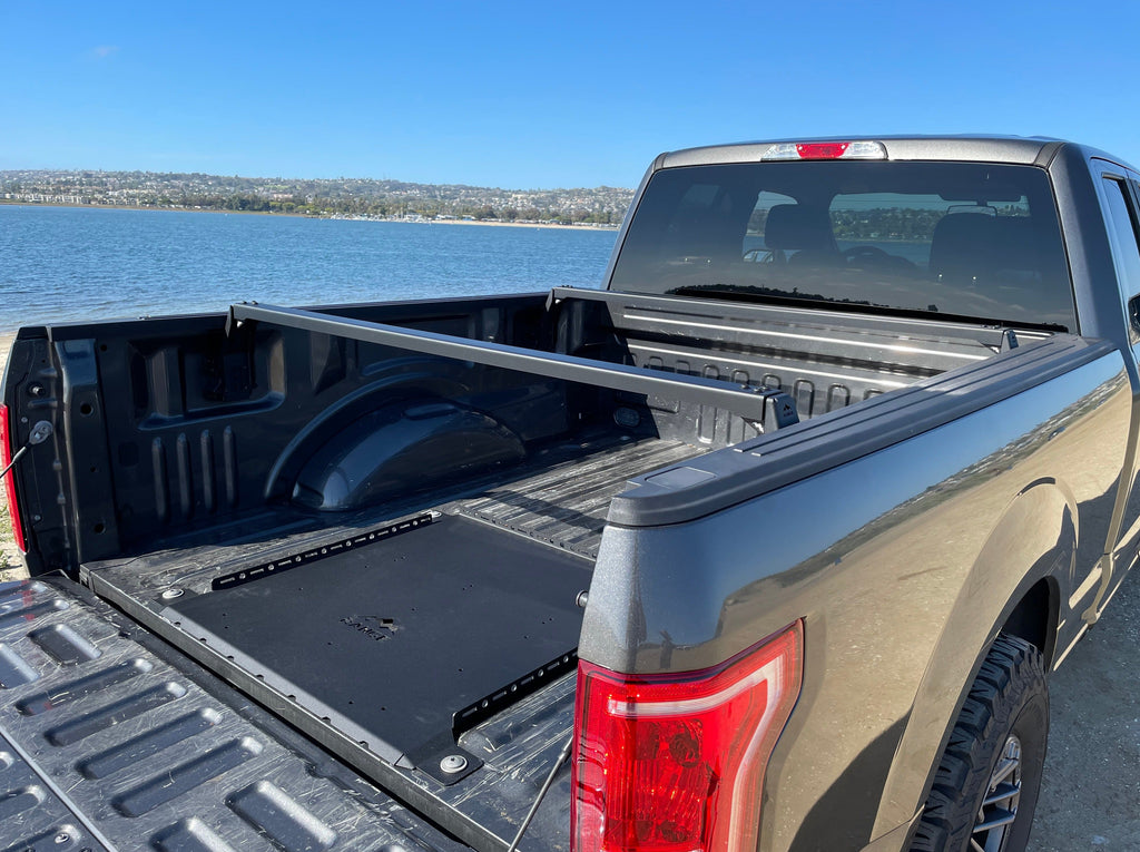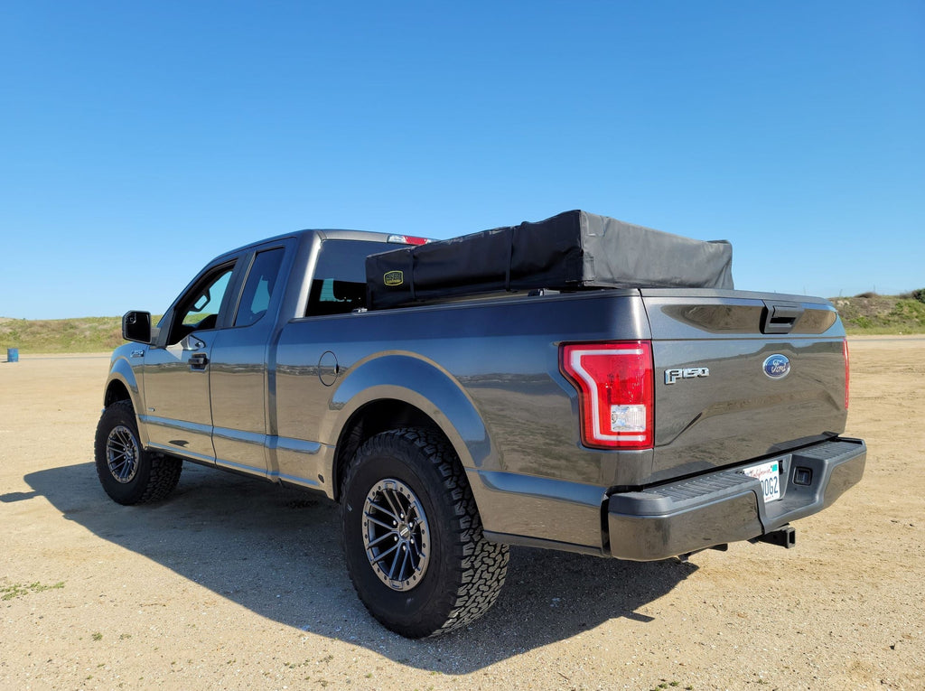This rooftop tent rack for 2015+ F-150 installs to factory mounting holes for the box link system and requires no drilling. The systems consists of 4 box link replacement blocks, 2 low profile crossbars and all stainless steel hardware.
