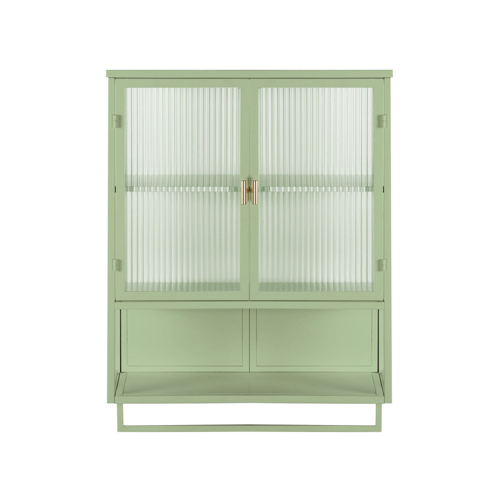 23.62"Glass Doors Modern Two-door Wall Cabinet with Featuring Two-tier Enclosed Storage, an Open Shelf, and Towel Rack, for Entryway Living Room Bathroom Dining Room,Green