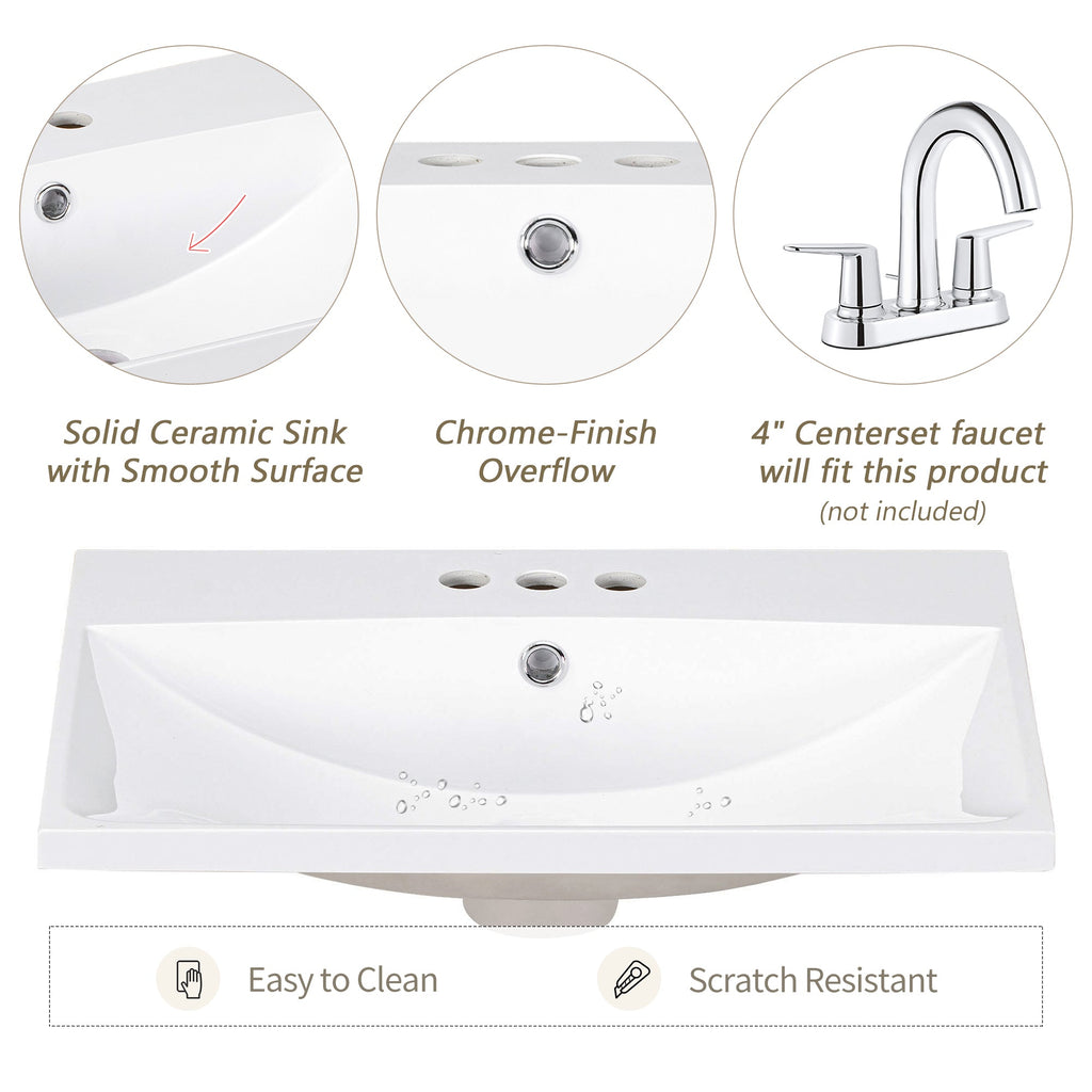 - Ceramic Basin: This bathroom vanity matches a drop-in basin to save more rooms, and holes are reserved in the basin for installation. This basin is suitable for mounting 4" center set faucets. The overflow hole is provided with a metal ring. The basin is made of ceramic, with a smooth surface that is waterproof and easy to clean.