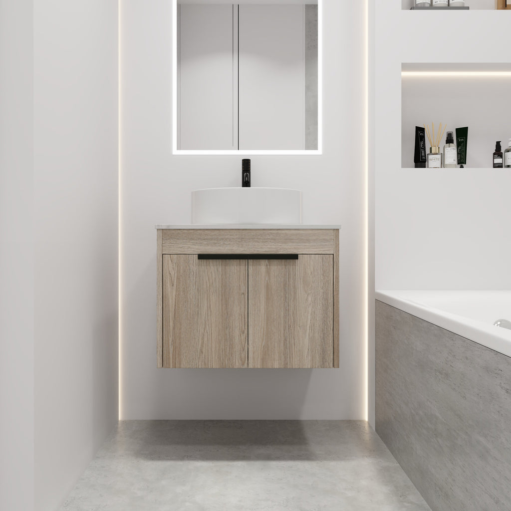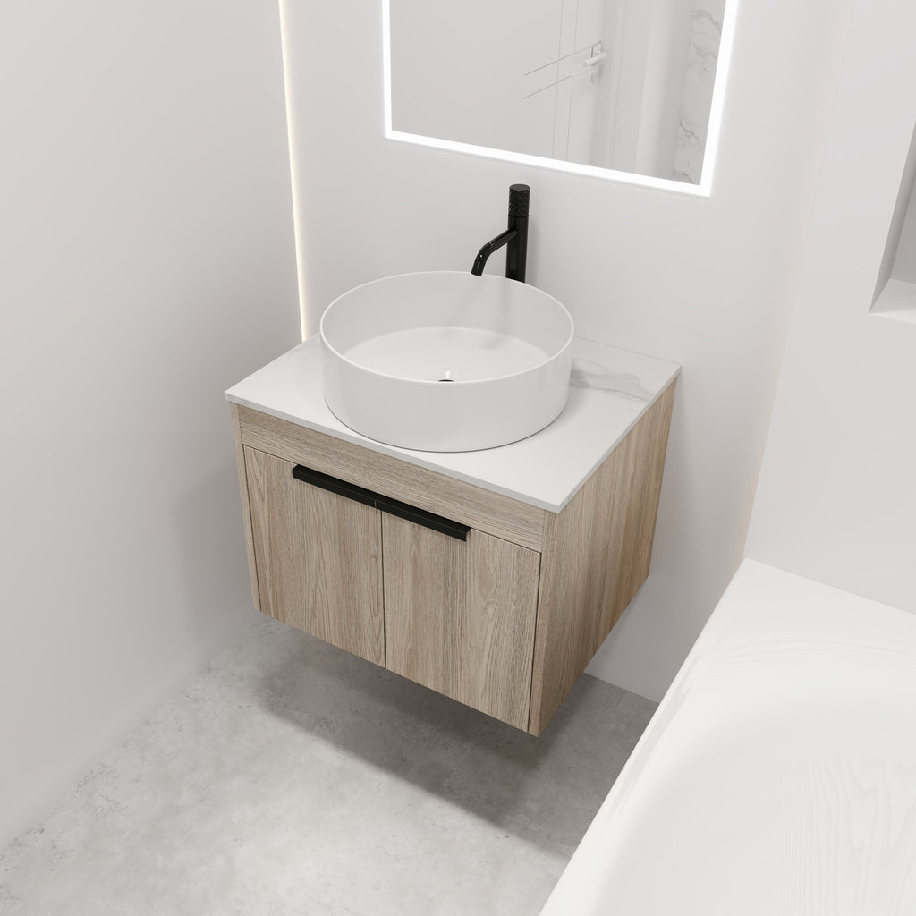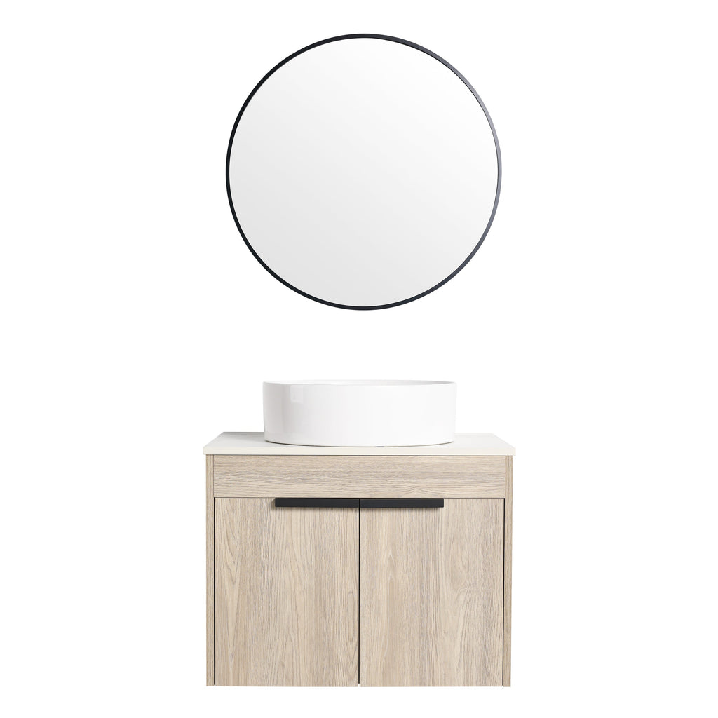 Simple double layer 24-inch white bathroom cabinet Construction: Plywood Assembly required: Included Assembling Accessories & Instructions. Not included Mirror, Faucet and Pop-up Drain Cabinet color: White Oak (Note: this vessel sink is single hole) Vanity Size: 23.6"W x 18.9"Dx 18.3"H Ceramic Sink Size:15.7"Wx 15.7"Dx 4.7"H. The bathroom vanity set has 2 Door Handles are High-quality Metal finished.Durable and strong.