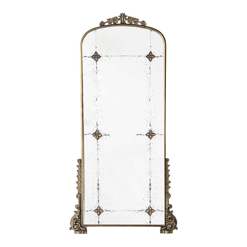 Drawing up inspiration from baroque styling, the Antique Gold Wall Mirror, brings the baroque decor to the 21st century. The 24×48.5″ mirror becomes modern day art leaning against a living room wall. The arch displays an intricate baroque design that flows throughout the mirror along the gold frame to an elegant base. Medallions along the seams of the antiqued glass complete the modern day look.