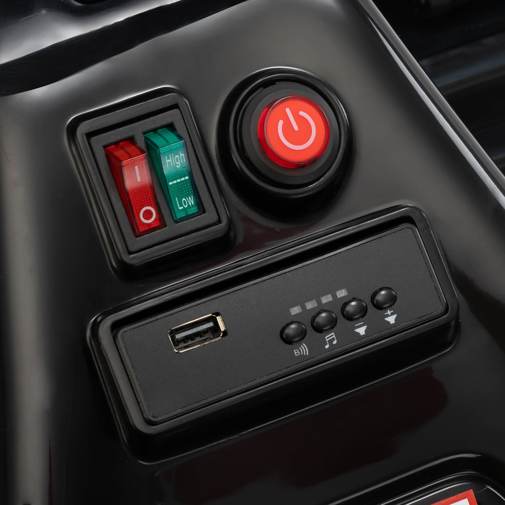 The functions are as follows: one click start; Control the direction through the steering wheel; There are two buttons on the left side of the power button, one red and one green (red is the light button; green is the high and low speed control button); The product comes with one white flagpole (height 81cm, diameter 5mm) and one triangular flag; The product comes with lighting (independent switch control), Bluetooth, music, and battery display; USB interface; Pedal throttle (right foot position), two-point seat belt.