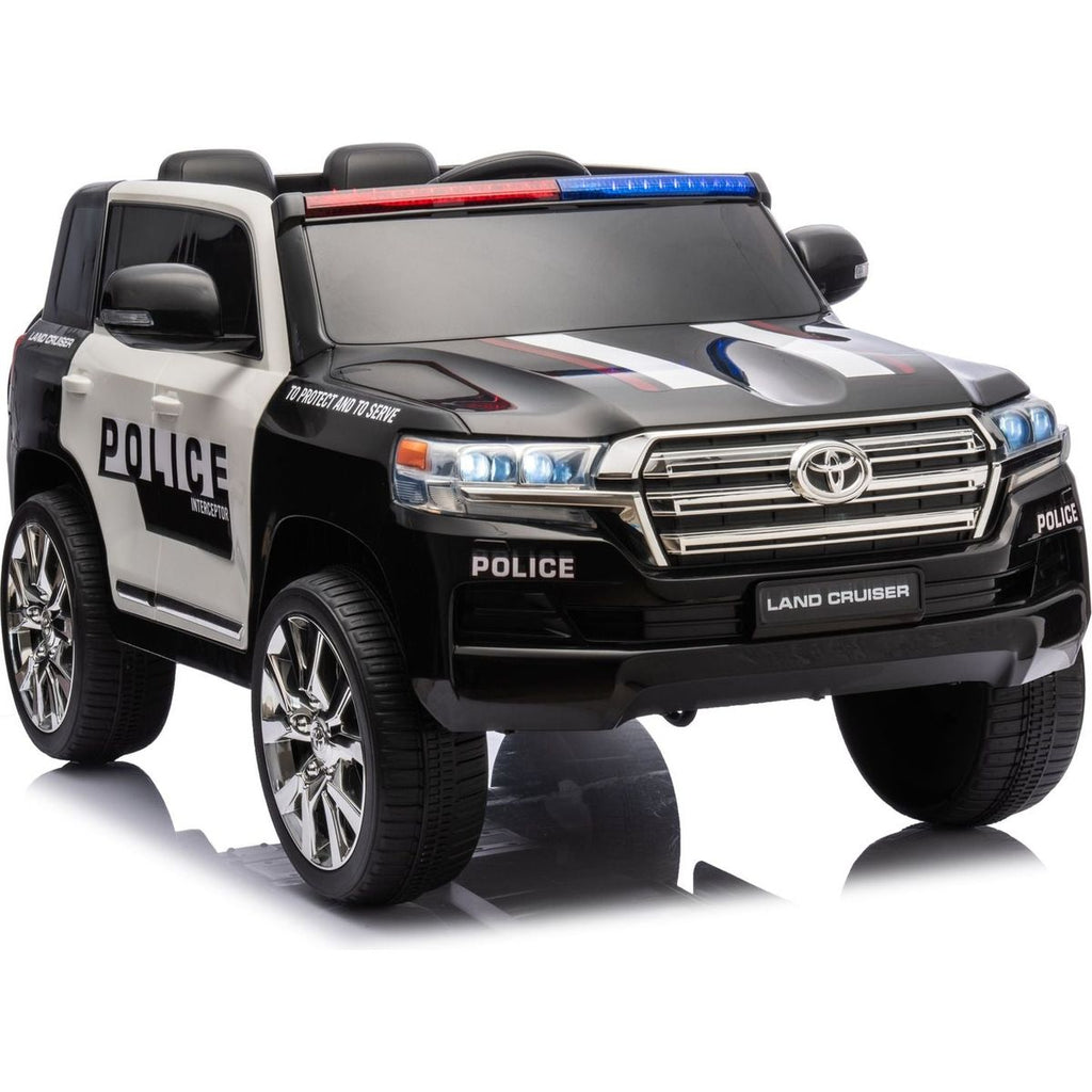 24V ride on police car is made of high-quality metal frame and plastic material, featuring durable plastic wheels at the bottom to provide a smooth drive even on uneven floors.