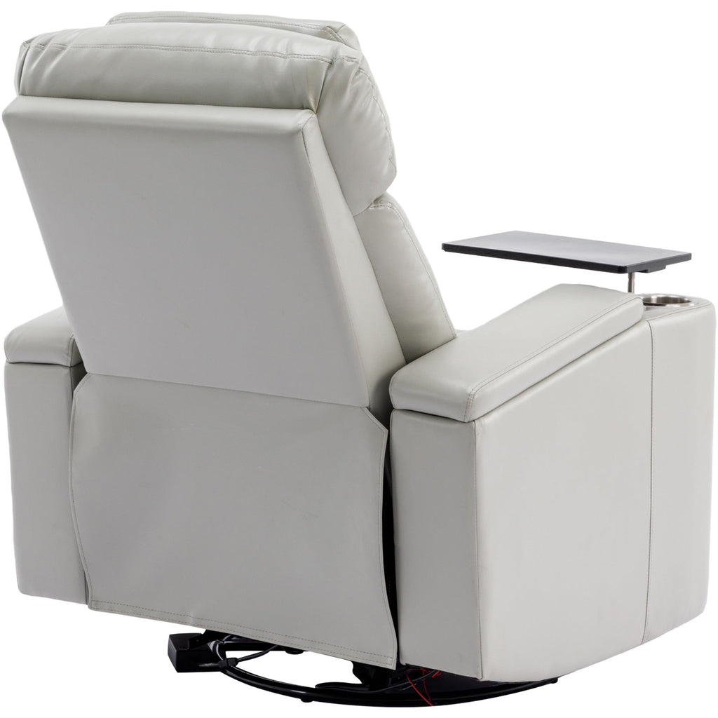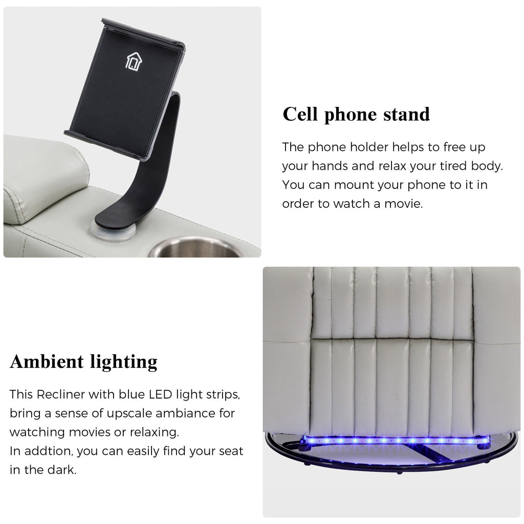 【Recliner Chair】Equipped with electric button design, smoothly adjust to reclining position you prefer by pressing two buttons from 90 degree to 160 degree without the worry of wire intertwining. 【USB Charging Port and Cup Holders】The chair has USB outlets that keep your devices charging and dual side pockets for small items within reach, two cup holders on both sides of armrests best meets your needs. 【360° Swivel Tray Table and Phone Holder】Swivel tray is perfect for use with a laptop or tablet when you need to work, or to hold your snacks during the show.Moreover,The reclilner with cell phone stand can free hands to look at the phone and adjust various viewing angles. 【Design for home theater】Enjoy the movie theater experience in your own home with your loved beings. Integrated and sturdy fame, made of durable metal to support body weight up to 330lbs.