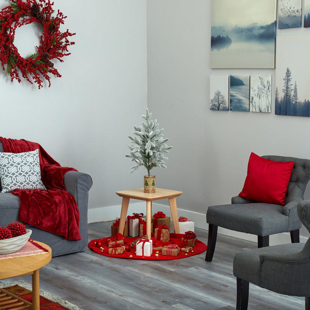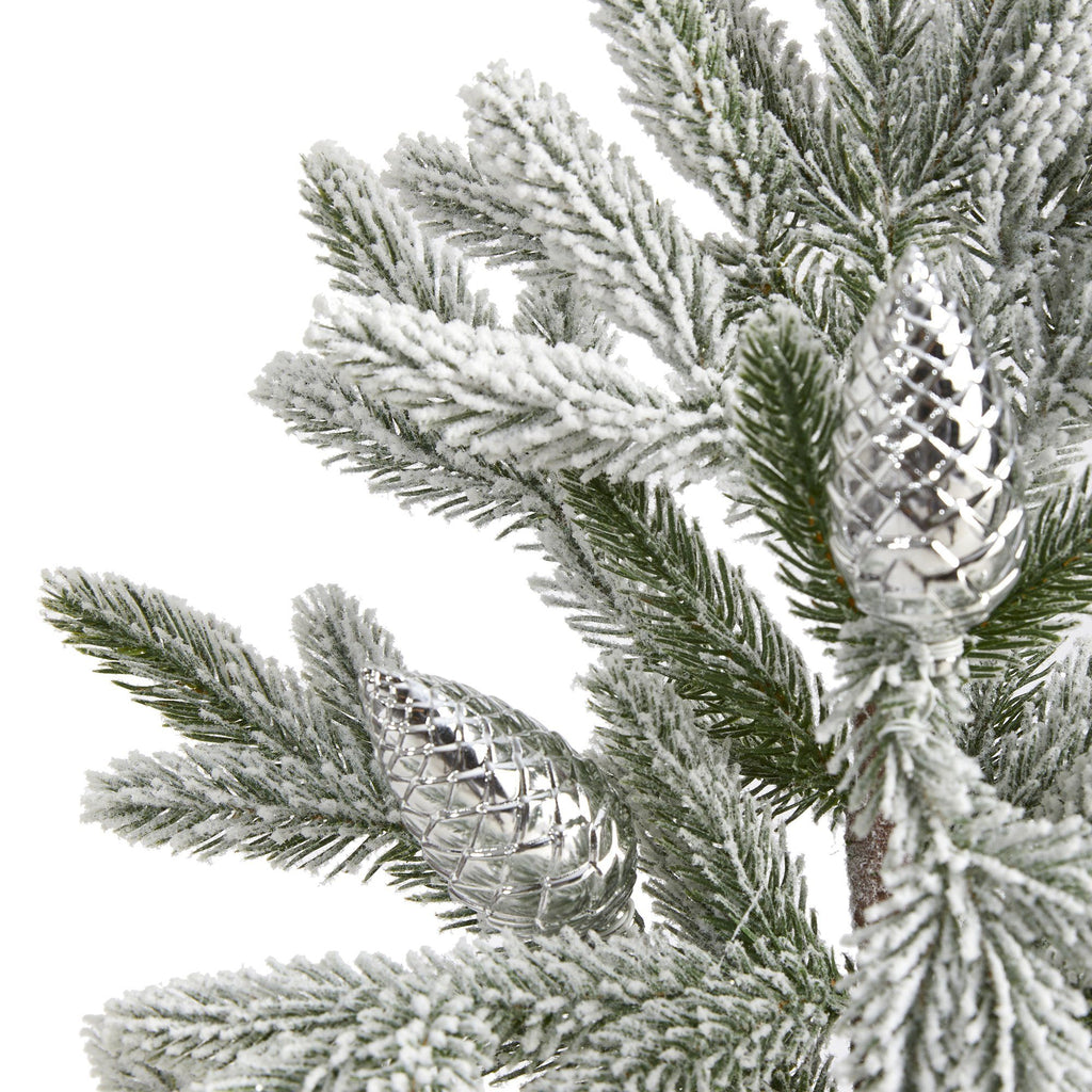 Evoke hints of the season no matter the space restriction with the help of this flocked artificial Christmas tree. Easy to set up and entirely maintenance-free, this timid little faux tree features a naturally sparse-like design with slender bendable branches for easy decorating and finished with a frosting of faux snow to evoke a winter-inspired setting. Standing just over 28’ tall and carefully stabilized in a decorative planter, this flocked artificial Christmas tree would undoubtedly make a stunning addition to any winter decor scheme.