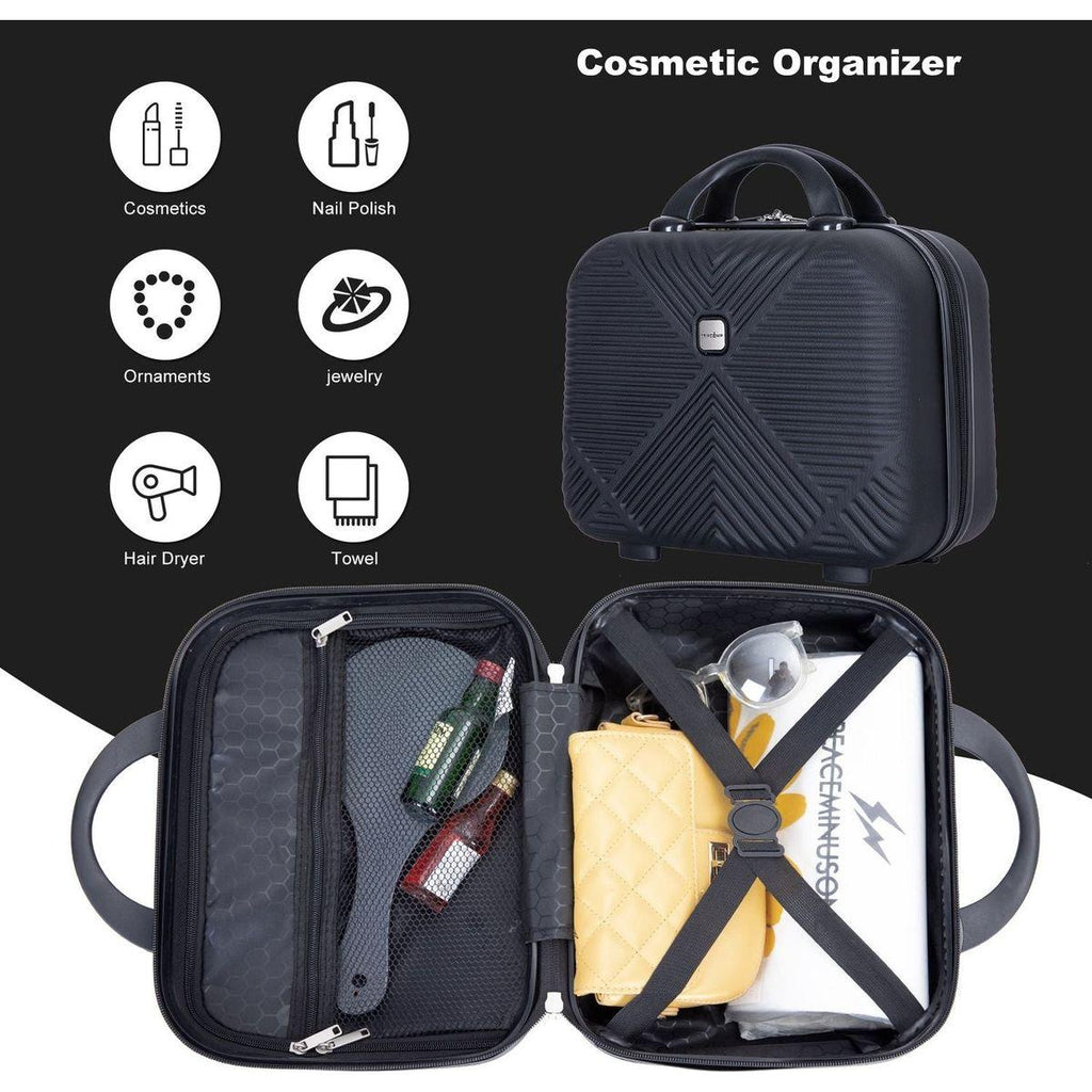 Material: 100%ABS Extremely lightweight and durable. 2 piece luggage set The 20-inch size is for carry-on luggage and the 14-inch size is for cosmetic cases. They can be stored in each other to provide more convenience and save storage space.