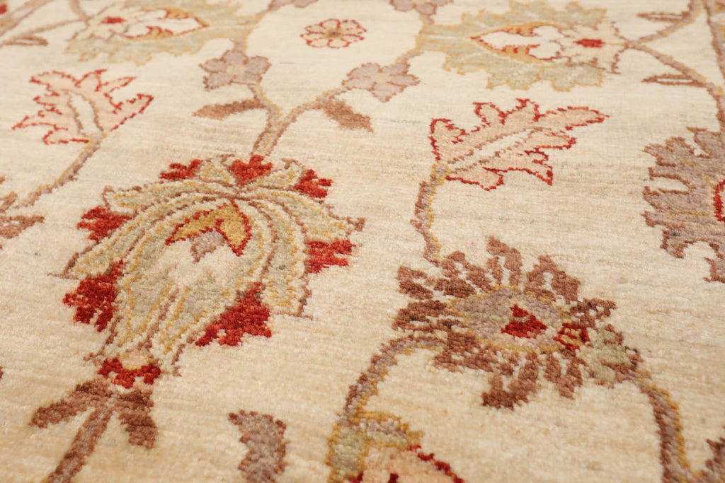 Story Behind the Art: Hand-knotted rugs are Pakistan's second-largest cottage and small industry that began as early as the 11th century under the Mughal rule. The craftsmen have the capacity to produce any type of rug using all the popular motifs of guls, medallions, paisleys (botehs), traceries, and geometric designs in various combinations. While the "stone washes" are used to fade and soften colors, the Peshawar style is characterized by a thinly sheered pile, large print designs, and most predominantly, their antique ivory and sometimes golden tones.