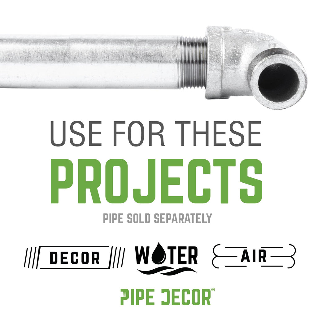 Add a modern look to your DIY projects with 90-degree street elbows. Create a one-of-a-kind desk, coffee table, or a piece of art. Galvanized fittings are silver in color with a shiny finish that brings a clean, polished look to your pipe furniture. Our fittings are made with durable, industrial-grade malleable iron. Fittings are 100% authentic and are made to stand the test of time. You will know PIPE DECOR parts and accessories when you hold them. Beauty and beast. Strength and style. These are real industrial fittings for your decorations and designs. Accept no substitutes. Extra pieces and accessories are available for your custom projects and expansions. Plug and play as desired.
