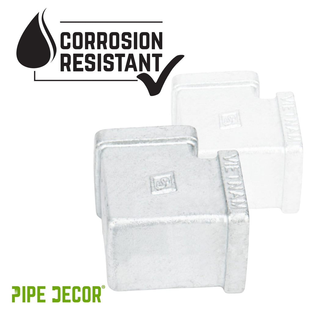 These are genuine galvanized pipe fittings that will stand the test of time. Galvanized malleable iron fittings are hot dipped in zinc, making them more resistant to corrosion. Our galvanized fittings are silver in color with a shiny finish that brings a clean, polished look to your pipe furniture. Galvanized pipes and fittings are prefinished, so you don’t have to clean or seal them before use.