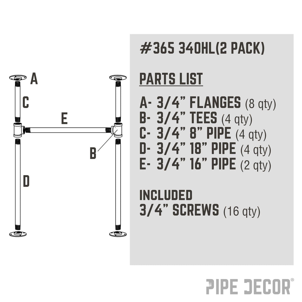 - Kit includes: (4) 3/4 in. x 8-inch pipes, (4) 3/4 in. x 18-inch pipes, (2) 3/4 in. x 16-inch pipes, (8) 3/4-in. round flanges, (4) 3/4 in. Tees, (16) screws, instructions, and a clean and seal sheet