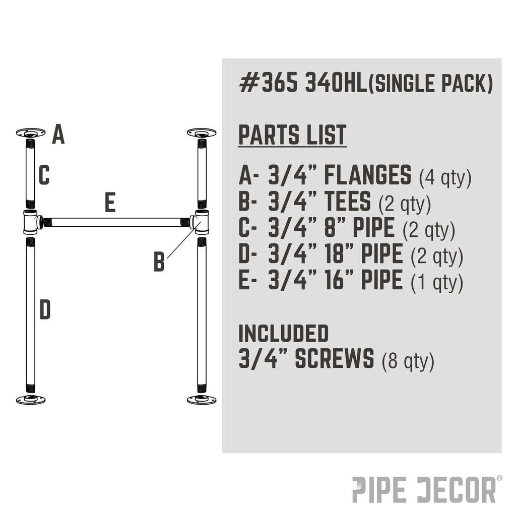- Kit includes: (2) 3/4 in. x 8-inch pipes, (2) 3/4 in. x 18-inch pipes, (1) 3/4 in. x 16-inch pipe, (4) 3/4-in. round flanges, (2) 3/4 in. Tees, (8) screws, instructions, and a clean and seal sheet