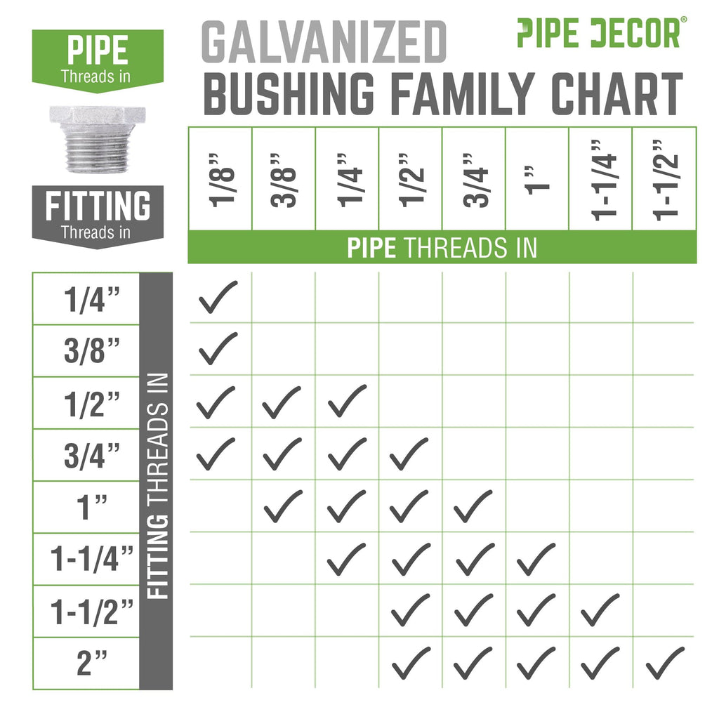 Make your standard fittings more versatile with our galvanized bushings. A bushing can be used in any project that involves connecting a larger fitting with a smaller pipe. Make the most of your DIY creations. Galvanized fittings are silver in color with a shiny finish that brings a clean, polished look to your pipe furniture. Our fittings are made with durable, industrial-grade malleable iron. Fittings are 100% authentic and are made to stand the test of time. You will know PIPE DECOR parts and accessories when you hold them. Beauty and beast. Strength and style. These are real industrial fittings for your decorations and designs. Accept no substitutes. Extra pieces and accessories are available for your custom projects and expansions. Plug and play as desired.