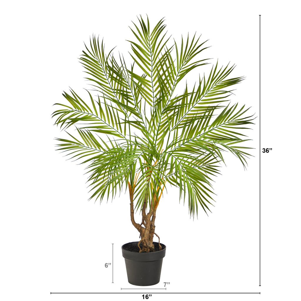 It's summer all year-round with this Areca Palm Artificial Tree. Inspired by the Florida beaches, lifelike palm fronds that feel real to touch arch in every direction, shape the branches to fit your space. Crafted from high-quality materials, see the trunk's intricate palette of vivid hues similar to those found on the sandy beaches. Standing 3' from a nursery planter (included in height), house in any area in need of a tropical touch. Add in a corner next to a chair for an elevated look. Perfect for those that crave the vacation state of mind 24/7.