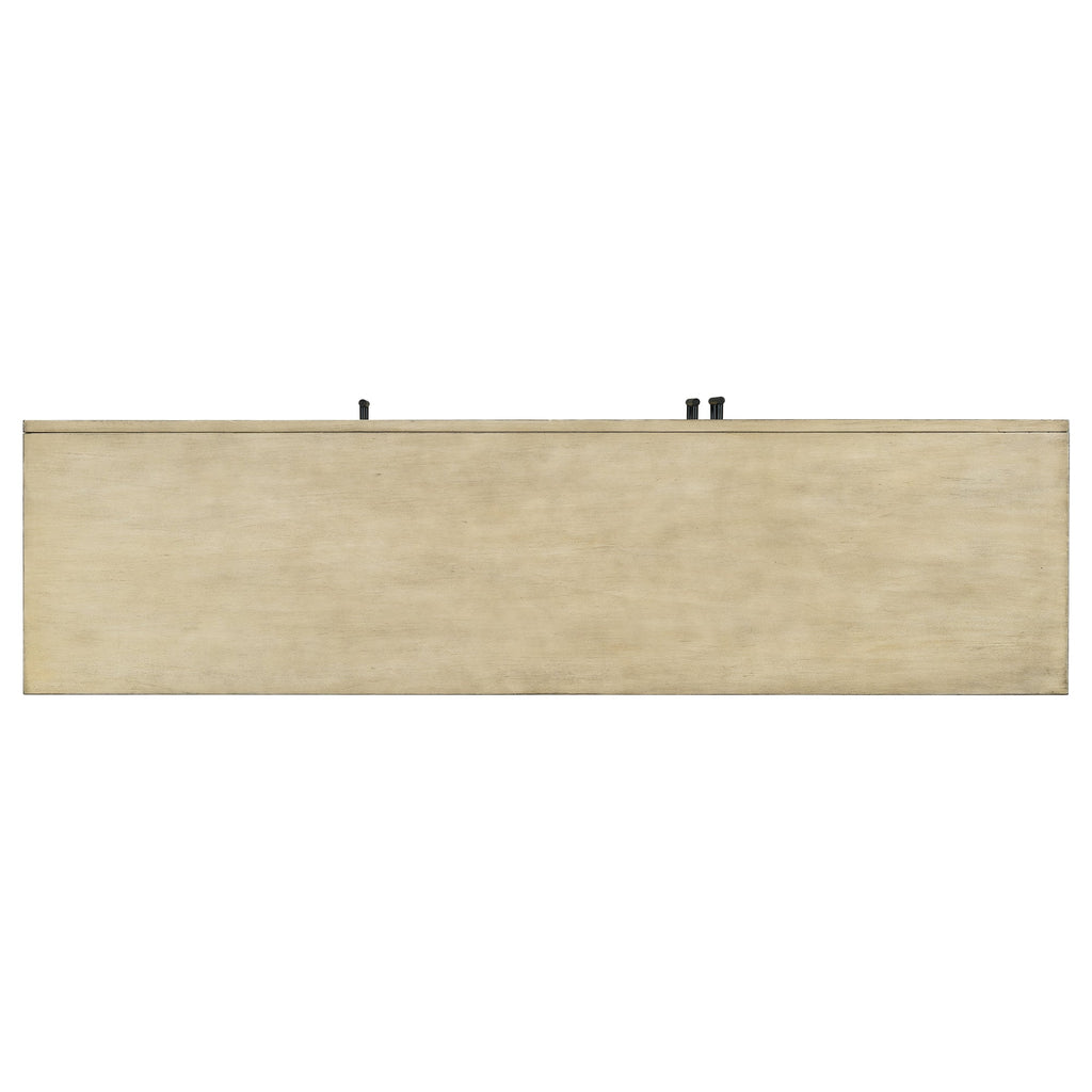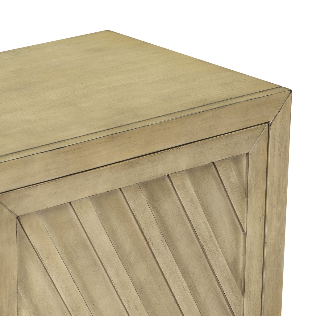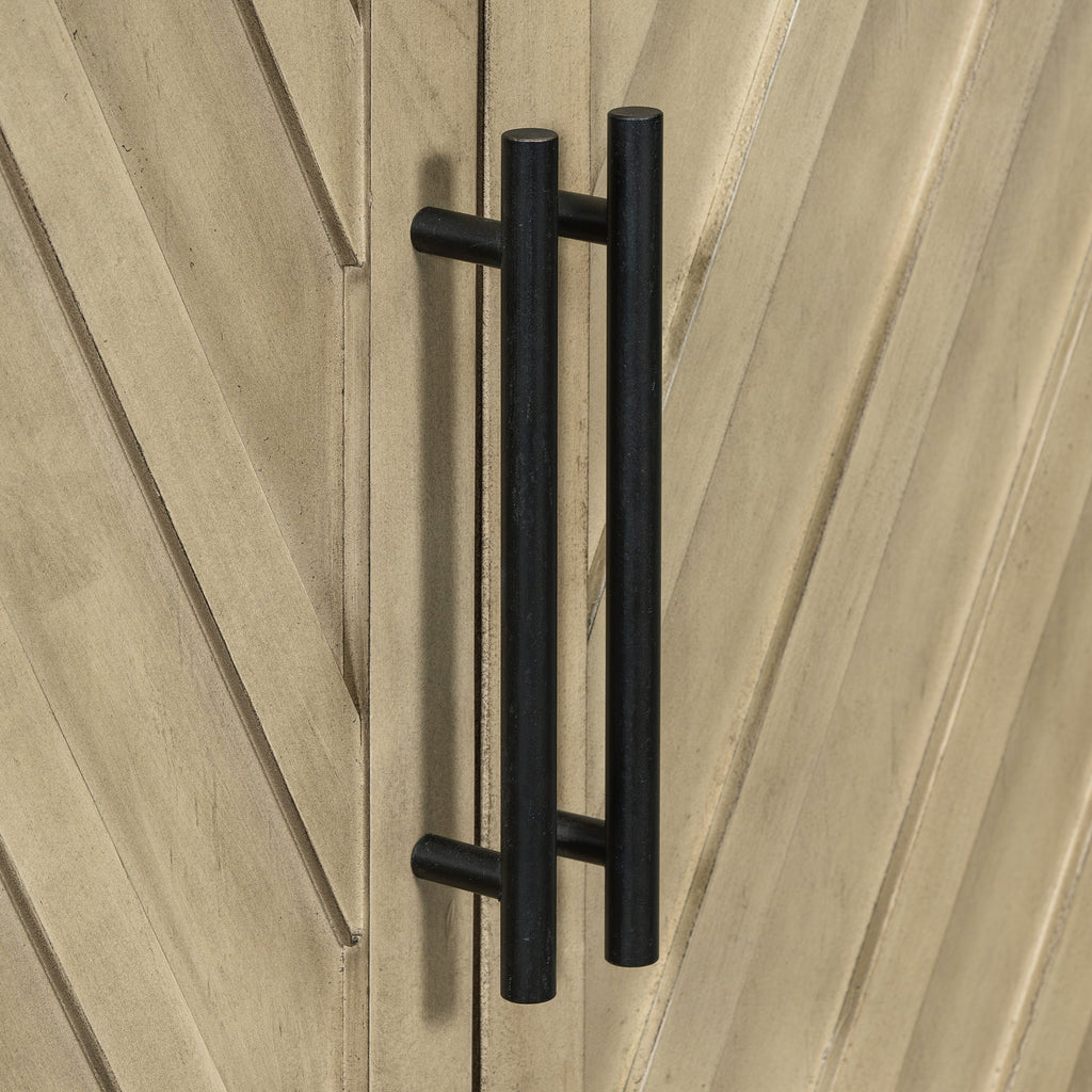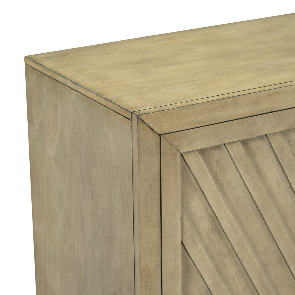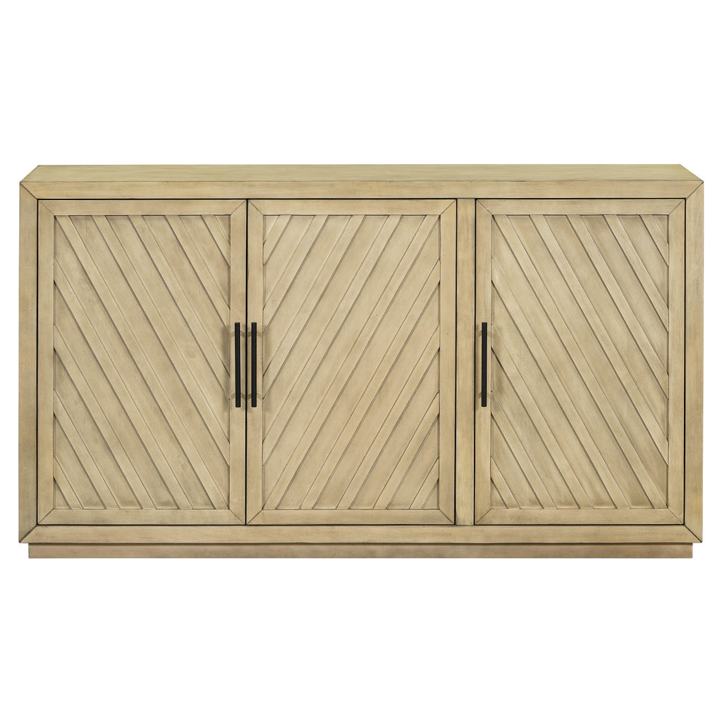 This is a sideboard with large storage space full of retro style. The surface of the sideboard has an aged effect of paint, which is low-key and stable. The unique diagonal stripes on the three cabinet doors make this sideboard even more unique. Coupled with the convenient and durable black linear handles, this sideboard is both beautiful and practical, suitable for being placed in the kitchen, dining room and living room.