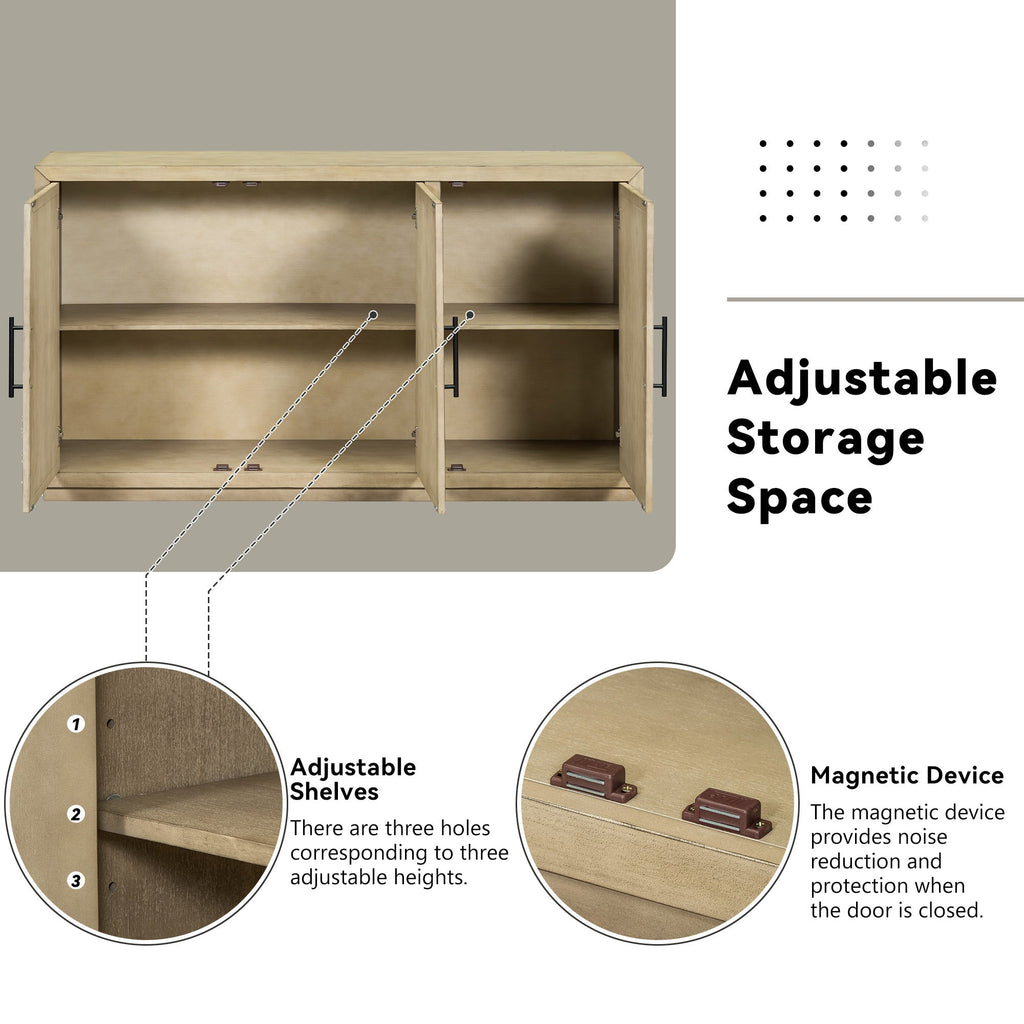 - Adjustable Storage Space: There is an adjustable height shelf on the left and right sides of the two cabinets of the sideboard, allowing you to adjust the appropriate height according to the size of the items. You can also remove the shelves directly to maximize space. In addition, this sideboard also has a magnetic device that locks when the door is closed. It is silent and also protects the door. Sideboard measures 60" L x 15.7" W x 34.3" H.
