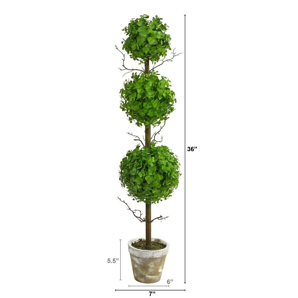 Bring a unique focal point into your space with this Eucalyptus Triple Ball Topiary Artificial Tree. Three Eucalyptus balls are perfectly trimmed and groomed into a wonderful sphere shape that stem from a slender, brown trunk. Standing 3’ from a rustic planter curate in spaces that need some light and a rustic touch. Place it near a hanged mirror on a table to create a mesmerizing sight for your guests.